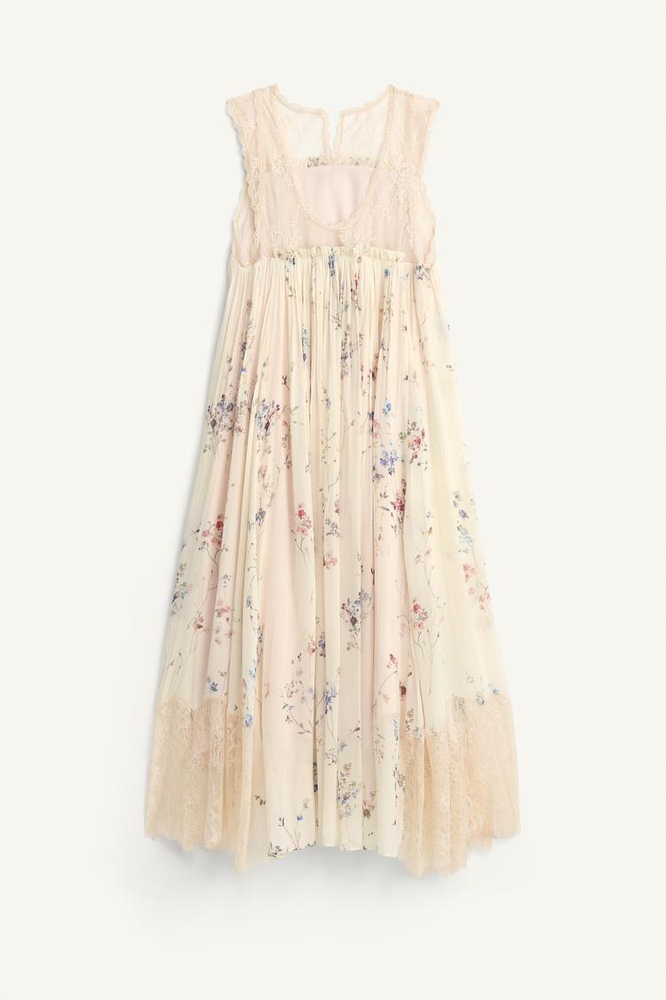 Миди-платье, изготовленное из основной ткани с вискозными волокнами. С круглым вырезом горловины и без рукавов. С контрастной цветочной принтовой отделкой. С кружевной аппликацией. Объемный расклешенный подол.