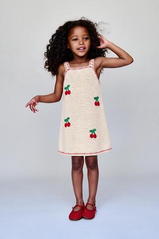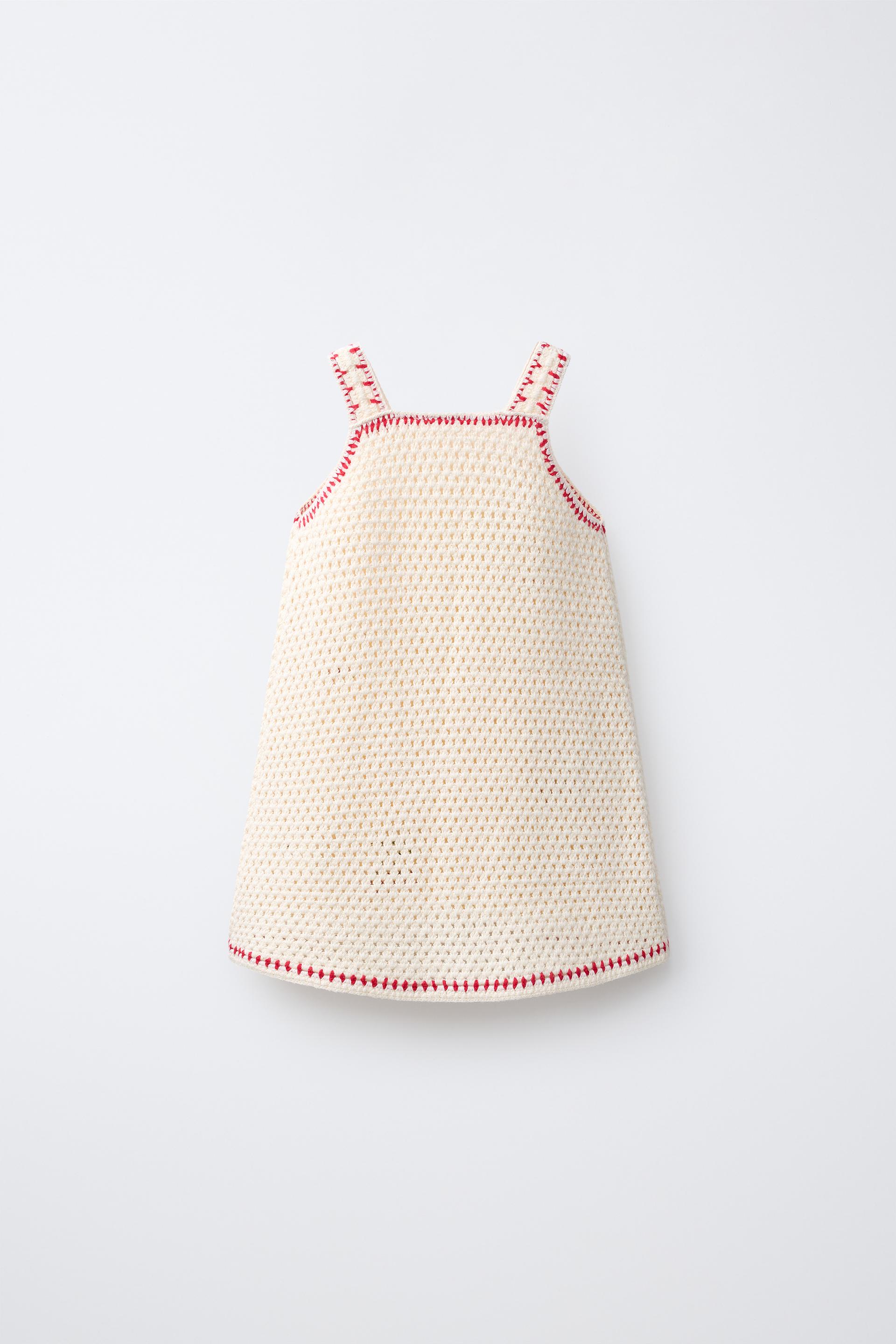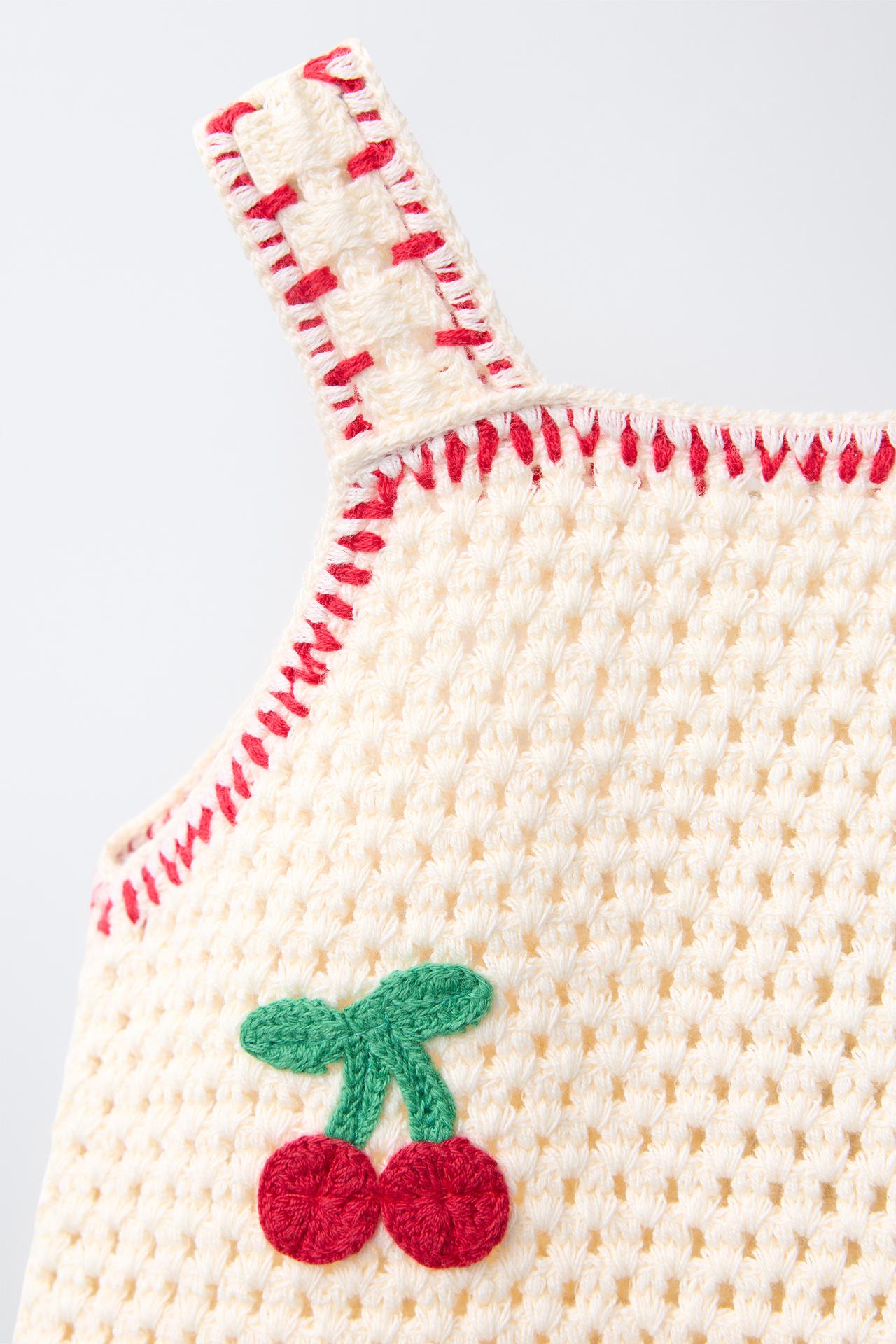 ZARA ПЛАТЬЕ ИЗ ТРИКОТАЖА КРОШЕ С ВИШНЯМИ, ЭКРЮ/КРАСНЫЙ