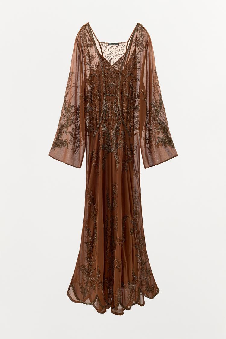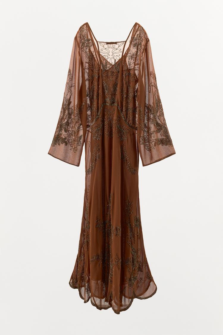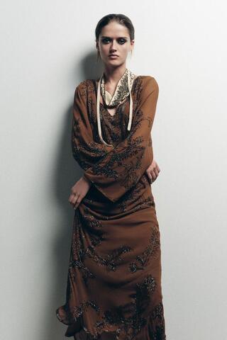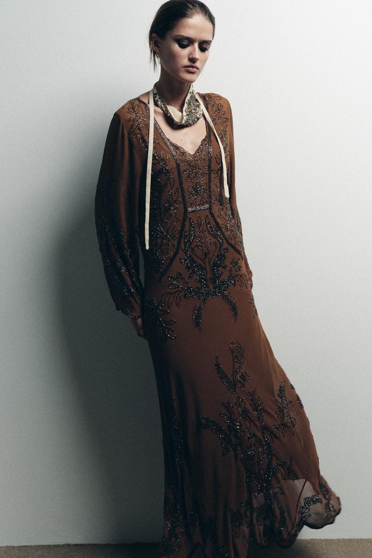 ZARA ПЛАТЬЕ ИЗ ЖОРЖЕТА С БУСИНАМИ LIMITED EDITION, КОРИЧНЕВЫЙ