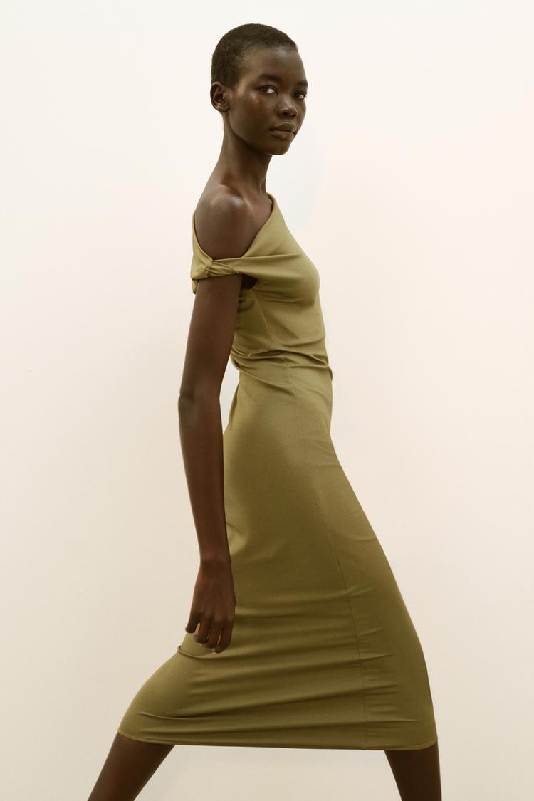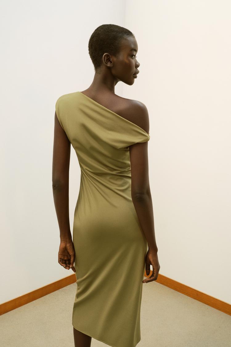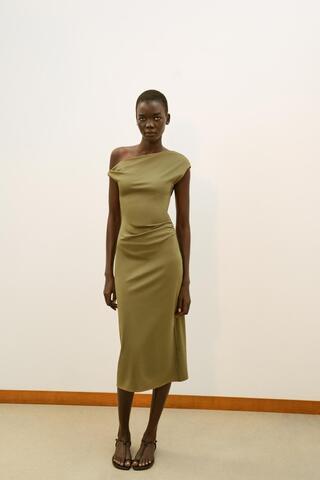ZARA ПЛАТЬЕ МИДИ АСИММЕТРИЧНОГО КРОЯ, ОЛИВКОВЫЙ