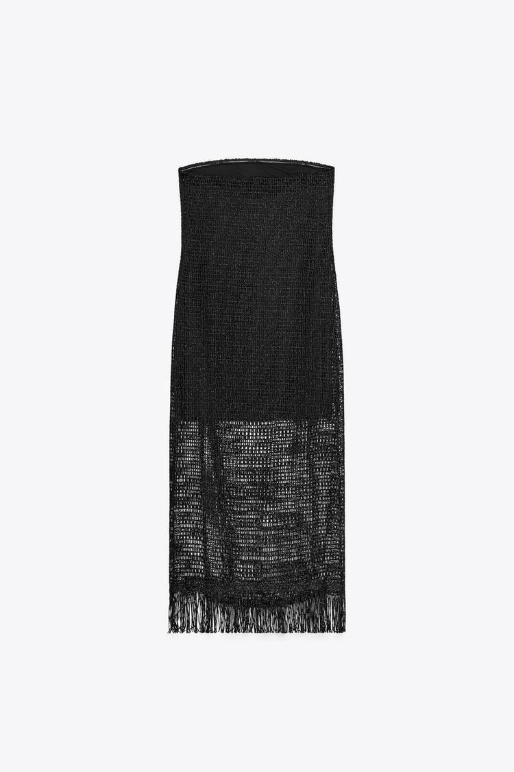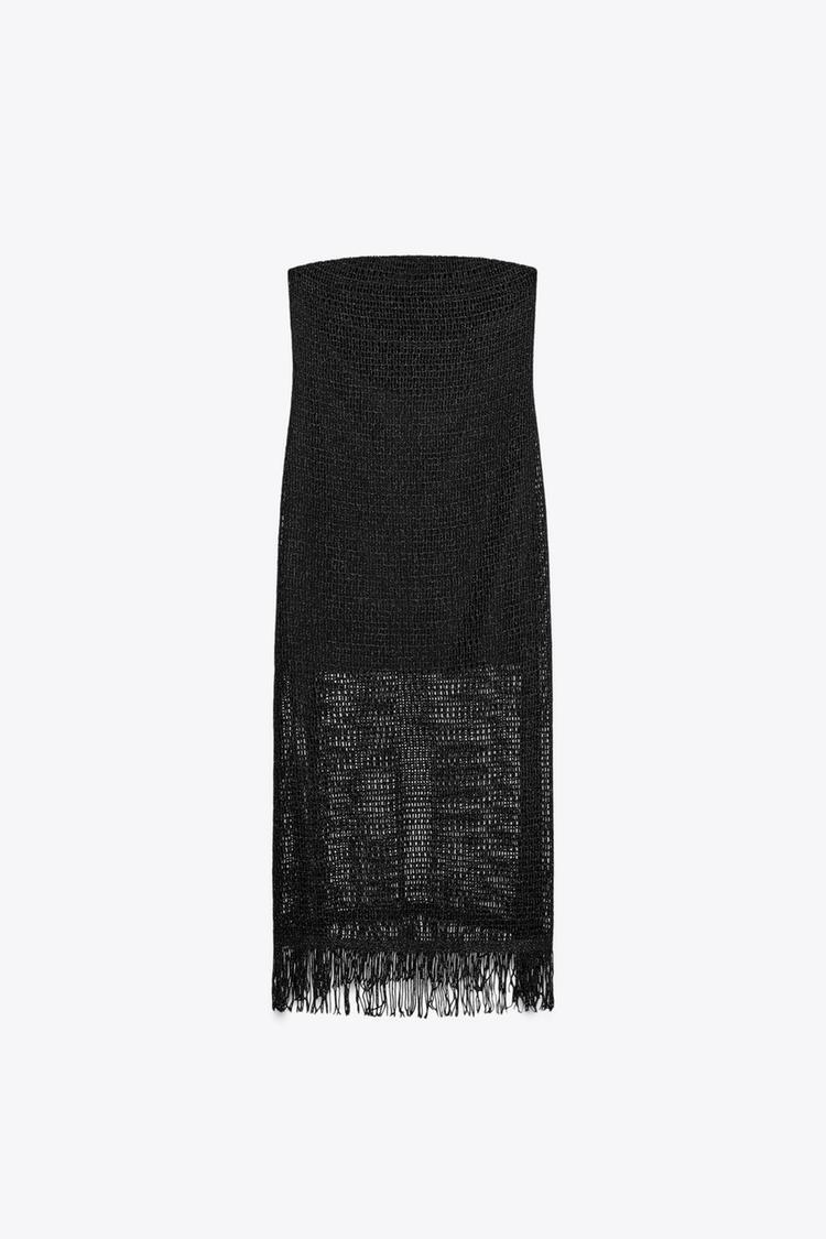 ZARA ПЛАТЬЕ МИДИ БЕЗ БРЕТЕЛЕЙ С БАХРОМОЙ, ЧЕРНЫЙ