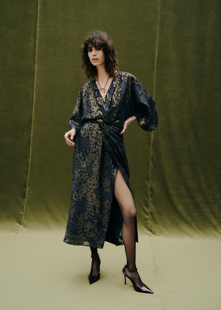 Платье с V-образным вырезом и широкими рукавами ниже локтя. Сборки спереди, блестящая ткань. Разрез спереди, подкладка. Потайная застежка-молния в боковом шве.