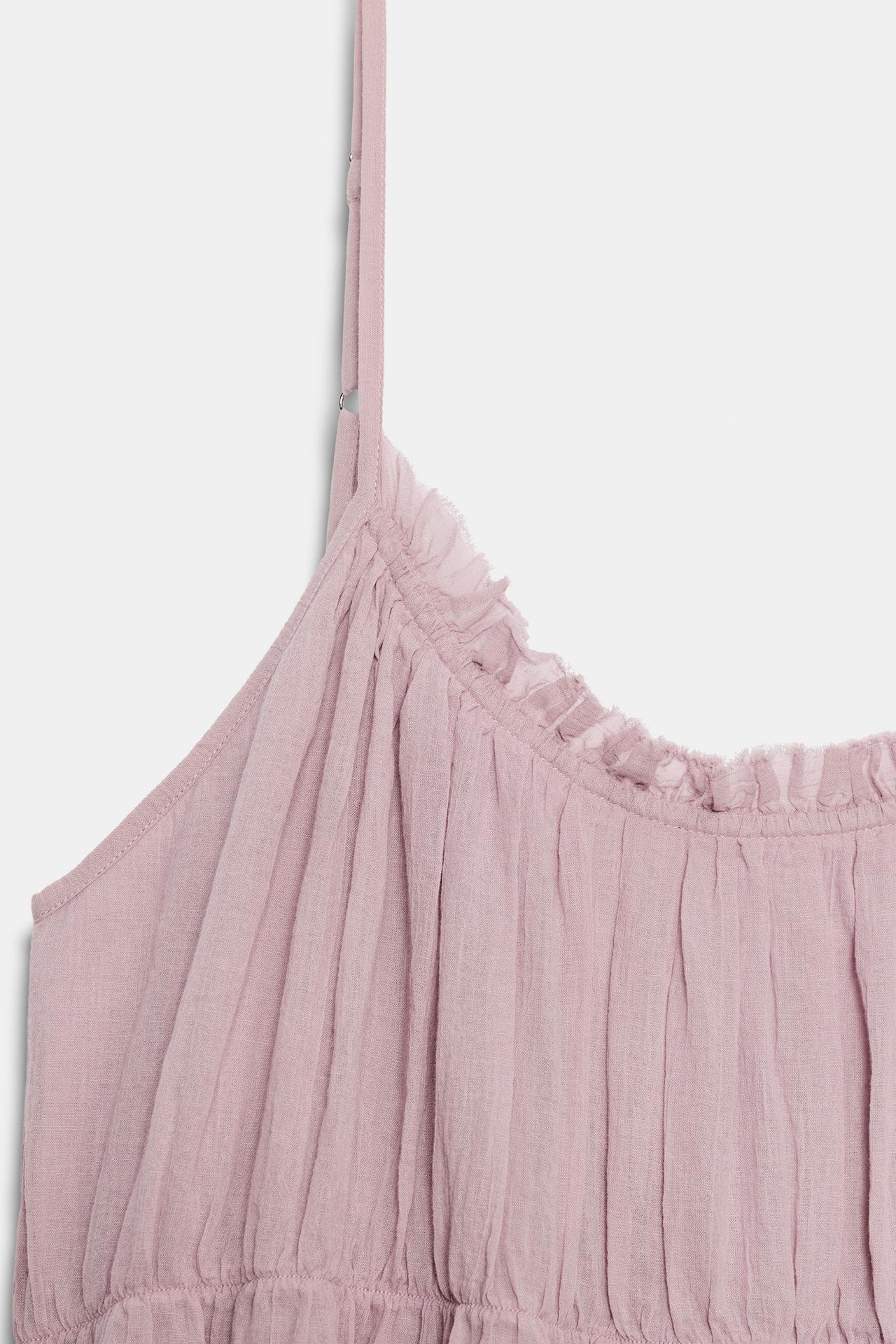 Платье с круглым вырезом и регулируемыми тонкими бретелями. Эластичная сборка на груди и воланы. Подкладка в тон.