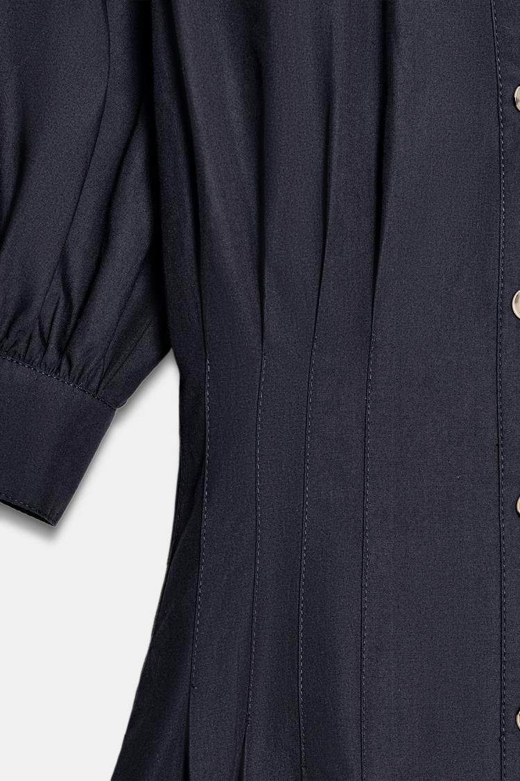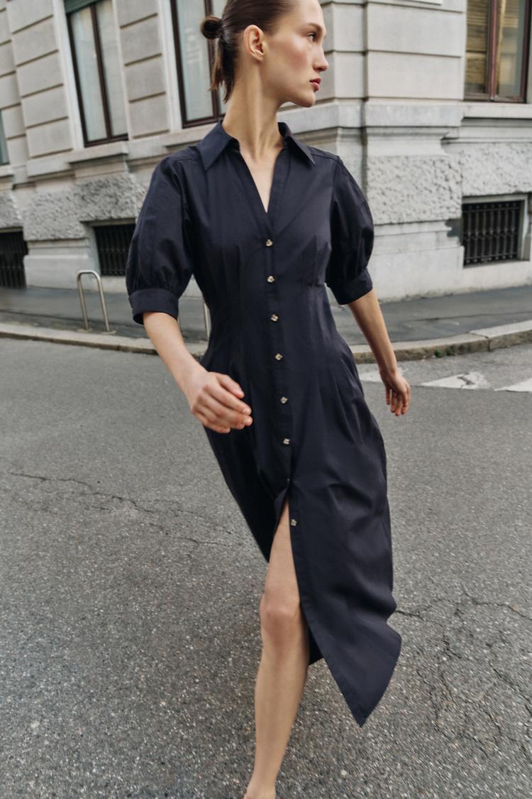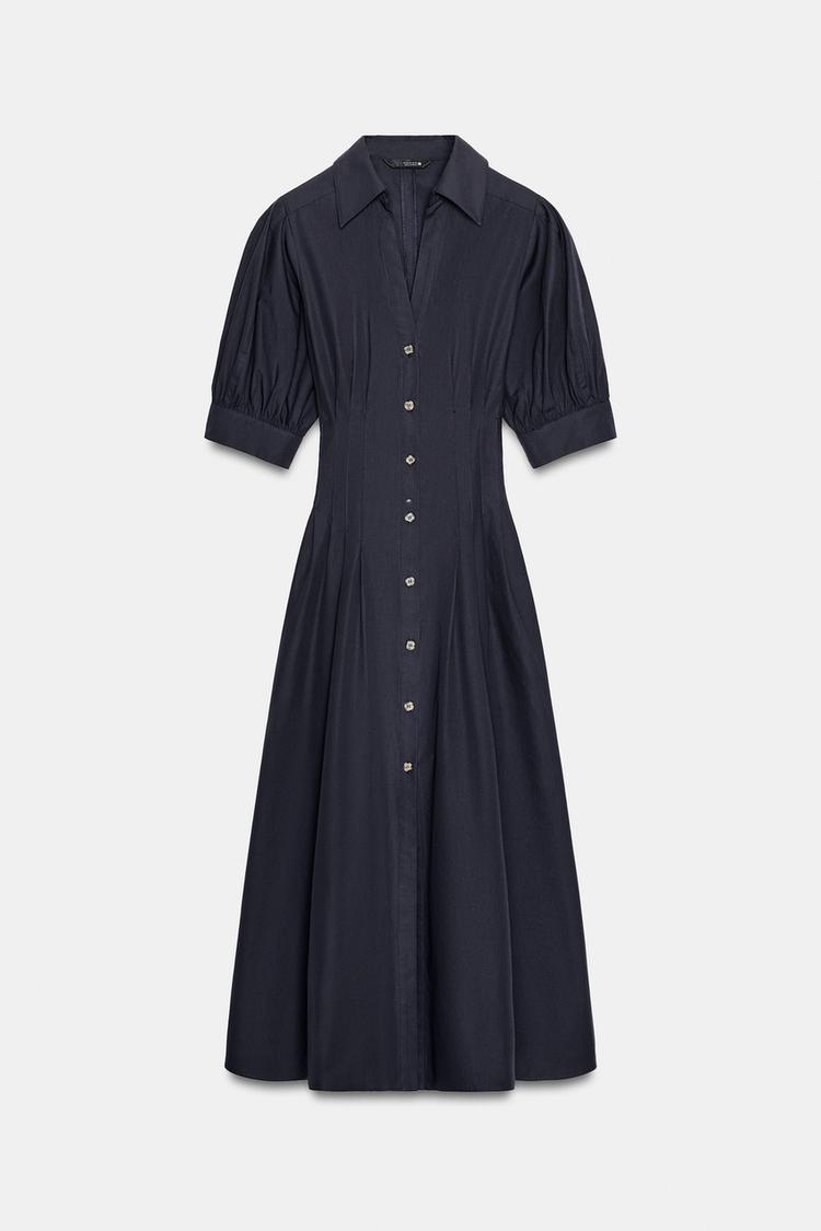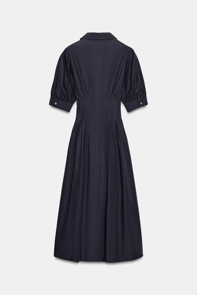 ZARA ПЛАТЬЕ МИДИ ИЗ ПОПЛИНА С ОБЪЕМНЫМИ РУКАВАМИ, МОРСКОЙ СИНИЙ