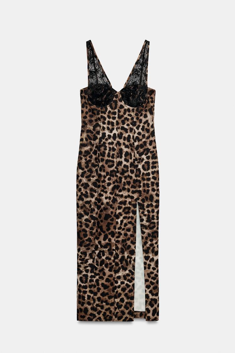 ZARA ПЛАТЬЕ МИДИ С АНИМАЛИСТИЧЕСКИМ ПРИНТОМ И КРУЖЕВОМ, ЛЕОПАРДОВЫЙ