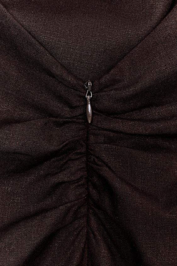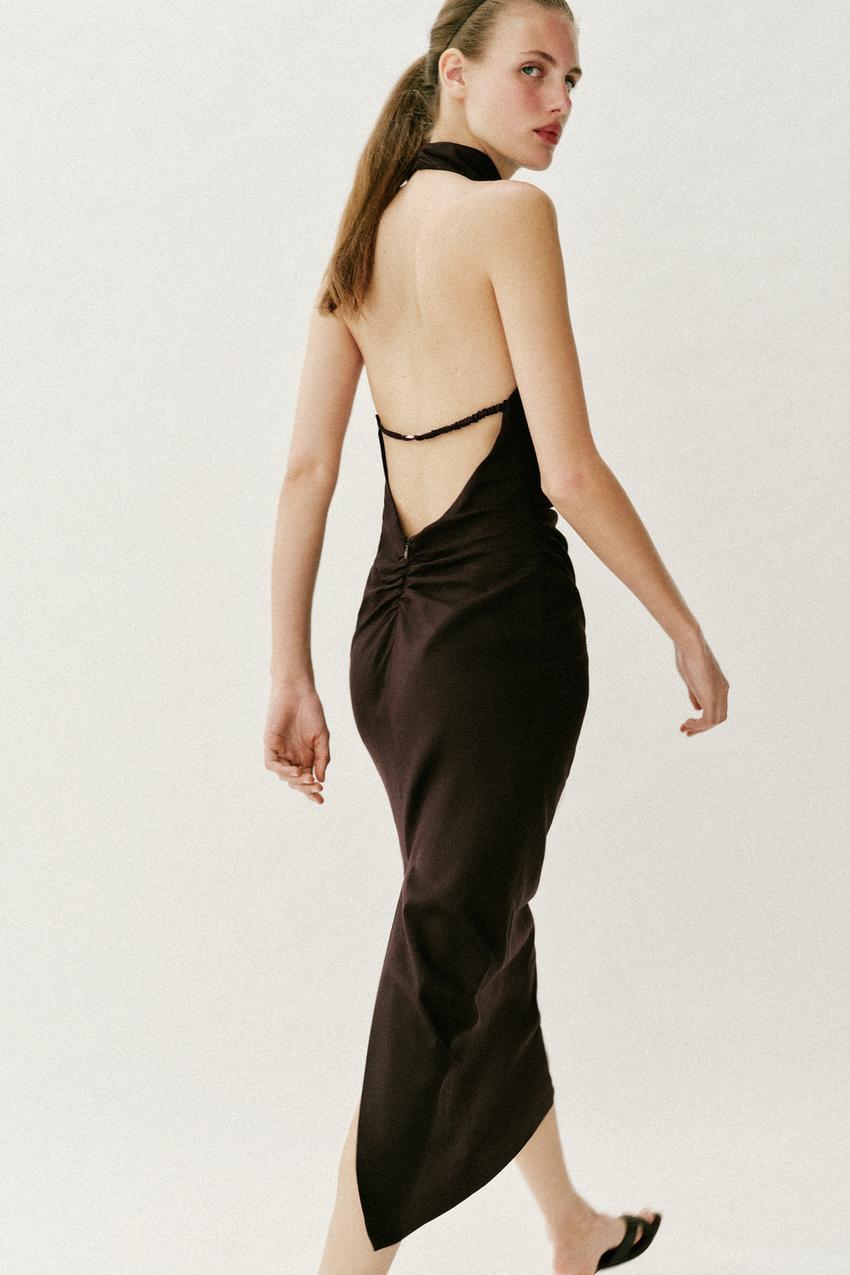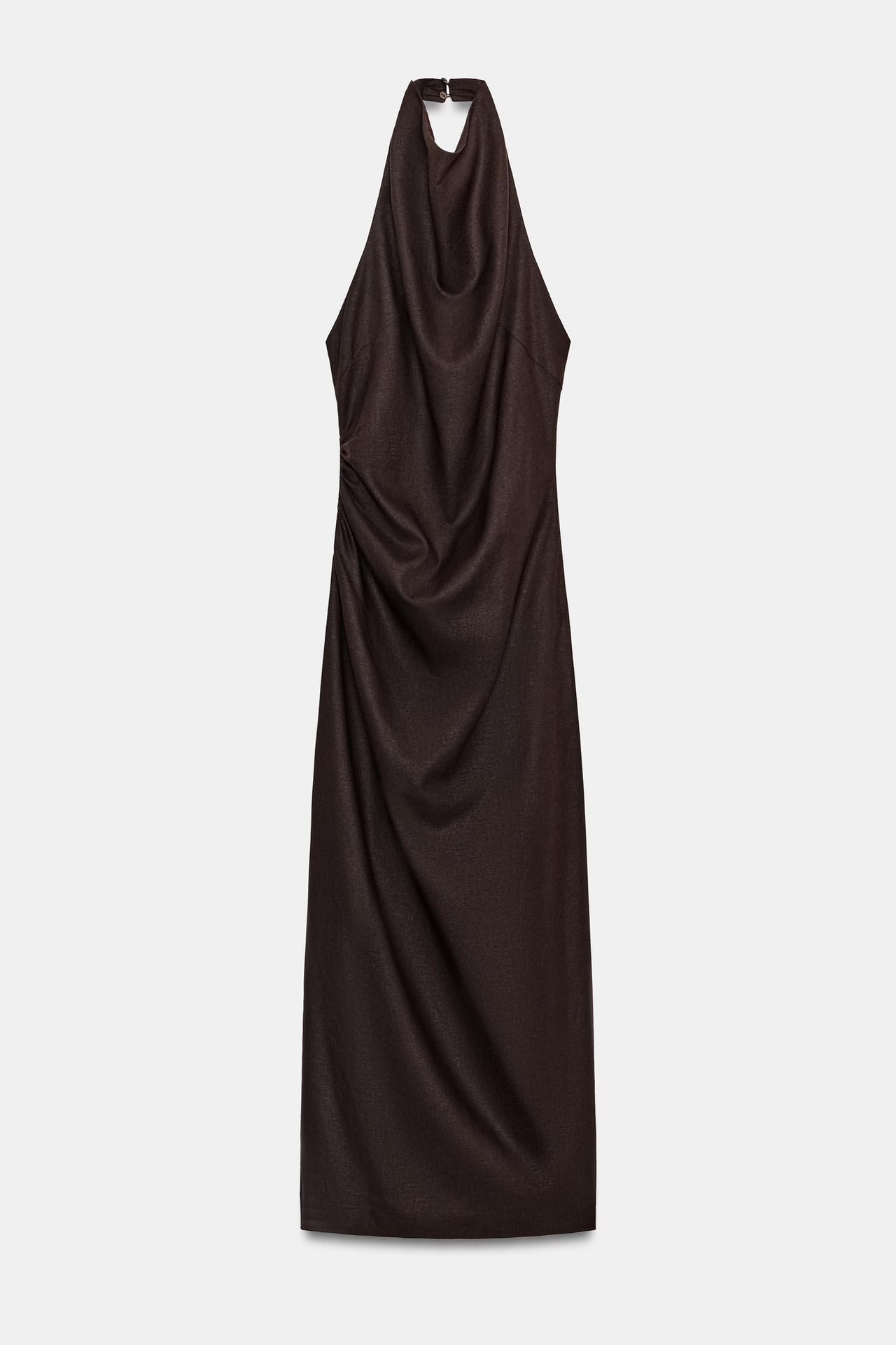 ZARA ПЛАТЬЕ МИДИ С ГОРЛОВИНОЙ ХАЛТЕР ИЗ ЛЬНА, ТЕМНО-КОРИЧНЕВЫЙ