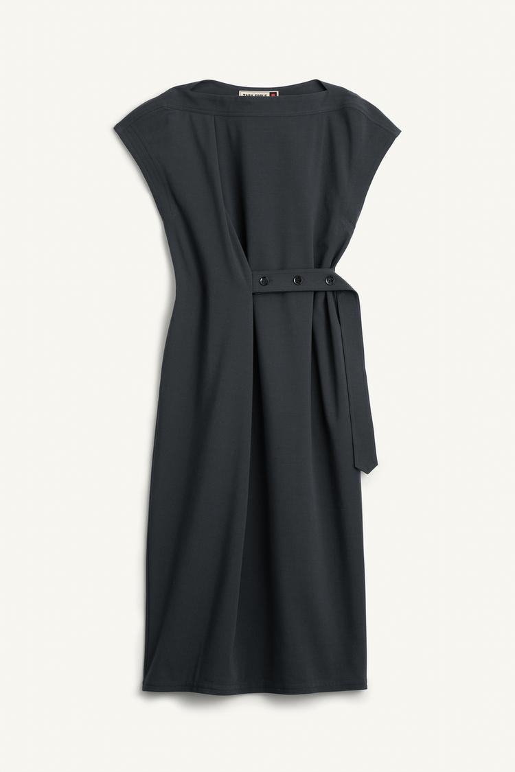 Миди-платье из 8% шерстяной пряжи с широким вырезом и короткими рукавами. Регулируемый пояс на пуговицах-молнии. Прямой крой.