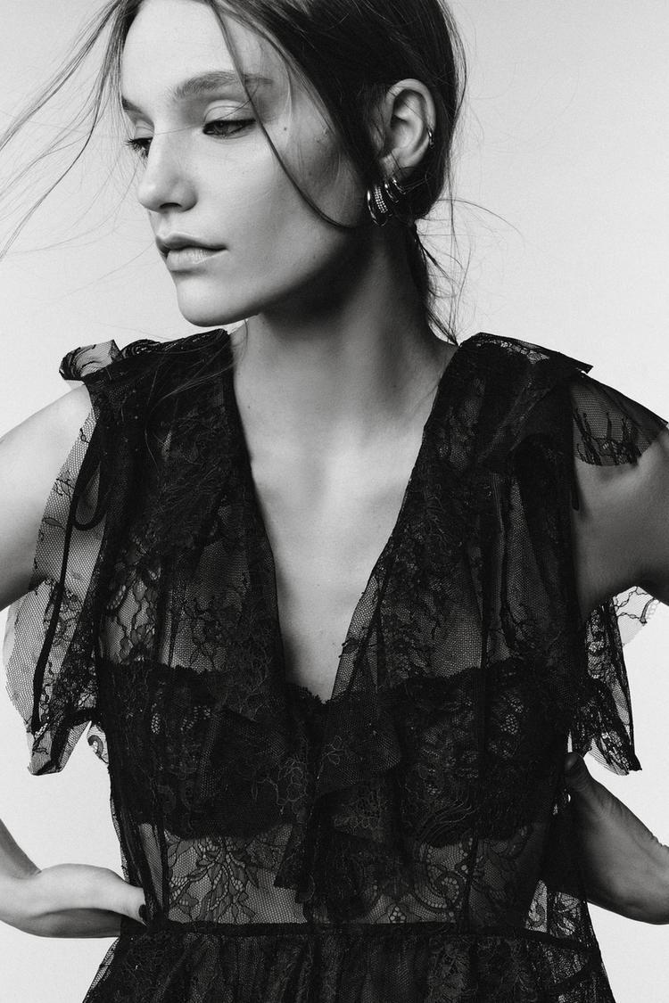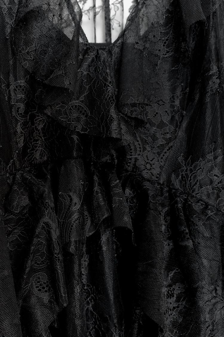 Платье миди с V-образным вырезом и короткими рукавами. Изготовлено из кружевной ткани. Тон в тон с внутренней подкладкой. Асимметричный подол.