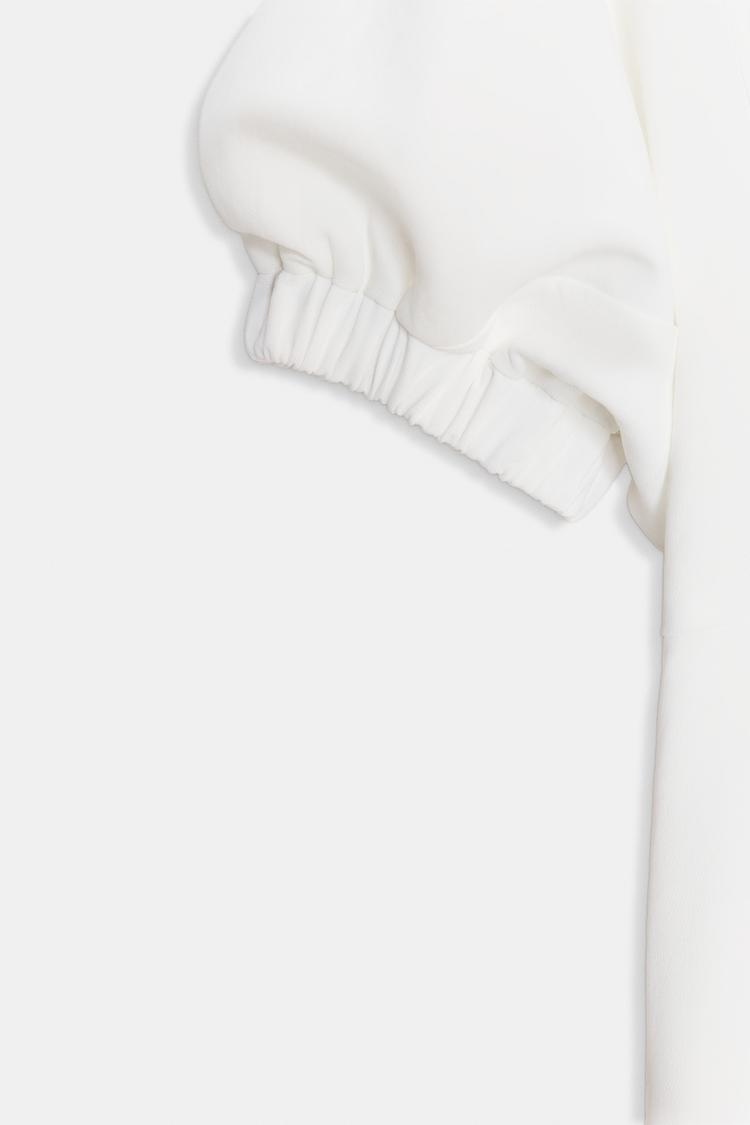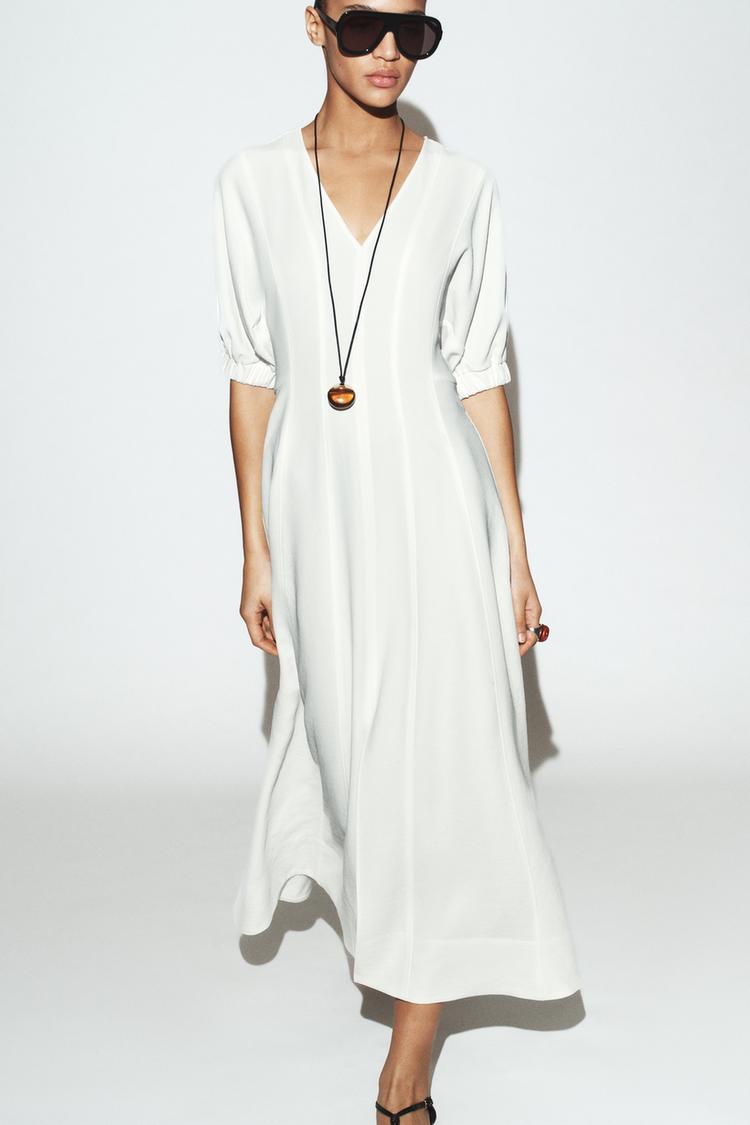 ZARA ПЛАТЬЕ МИДИ С ОБЪЕМНЫМИ РУКАВАМИ, ЖЕЛТОВАТО-БЕЛЫЙ