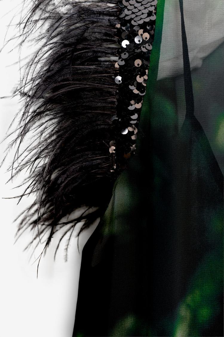 Миди-платье без рукавов с круглым вырезом и аппликацией из перьев. Пояс с пайетками. С внутренней подкладкой. С открытой спинкой и застежкой на пуговицы.