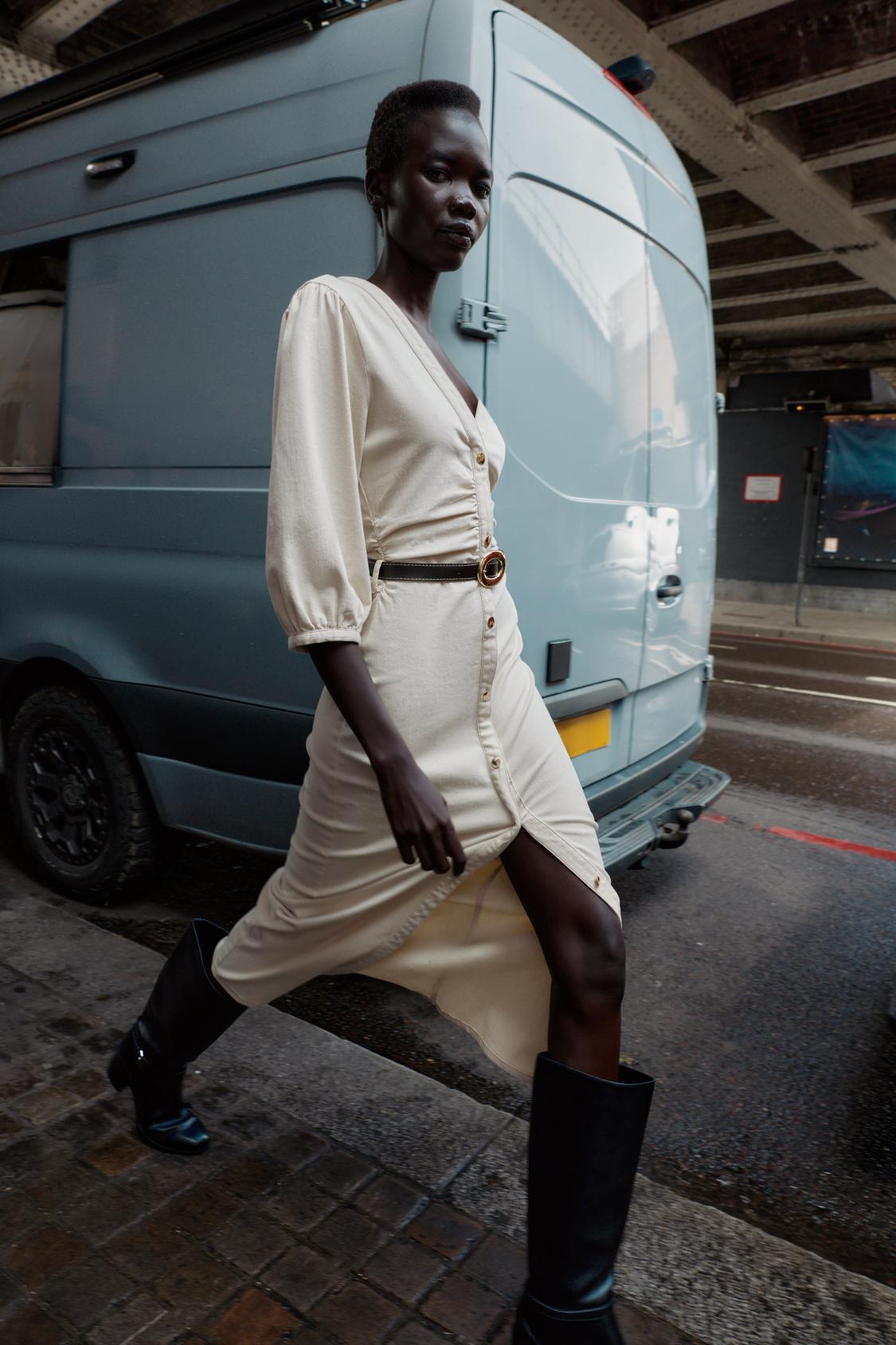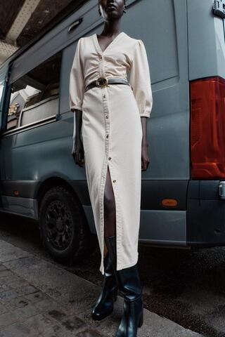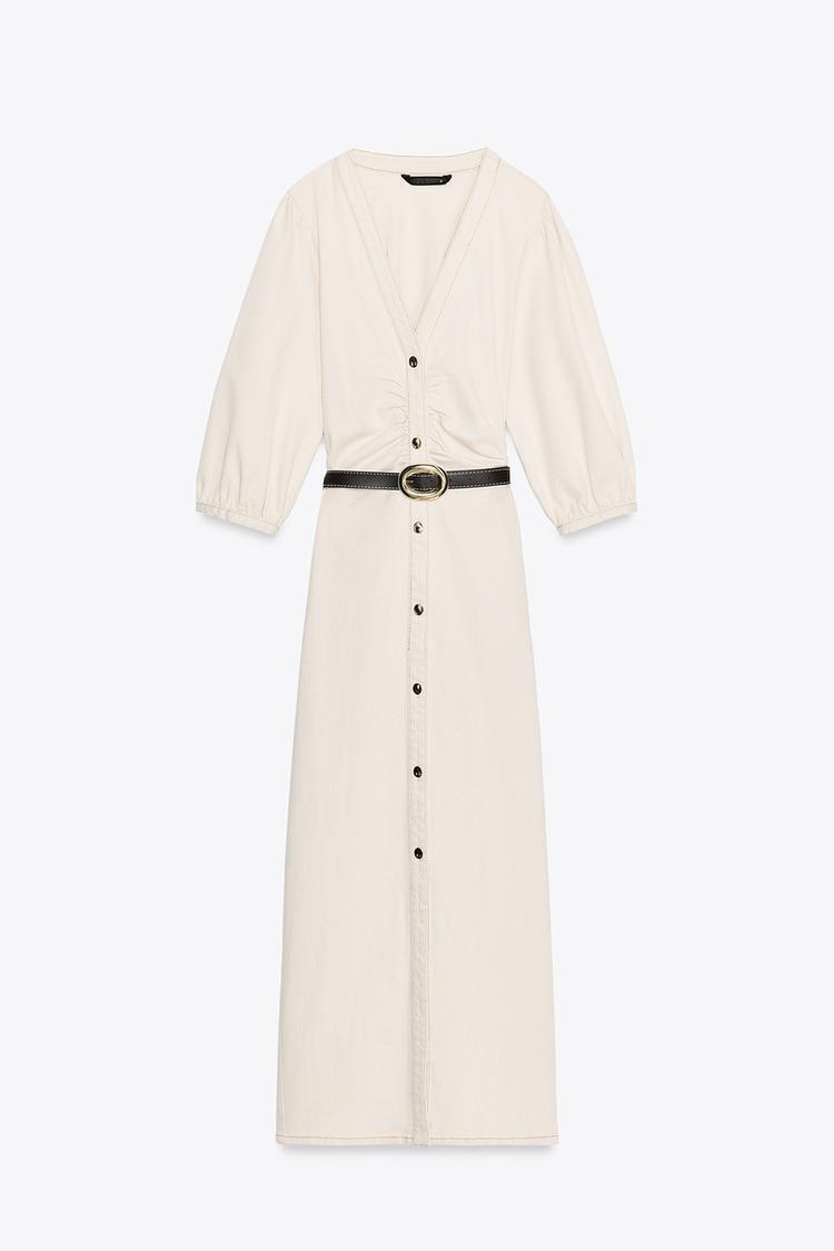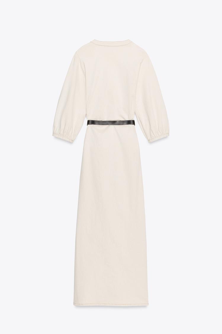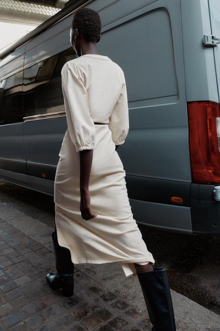 ZARA ПЛАТЬЕ МИДИ С РУКАВАМИ-БУФАМИ И ПОЯСОМ, ЭКРЮ