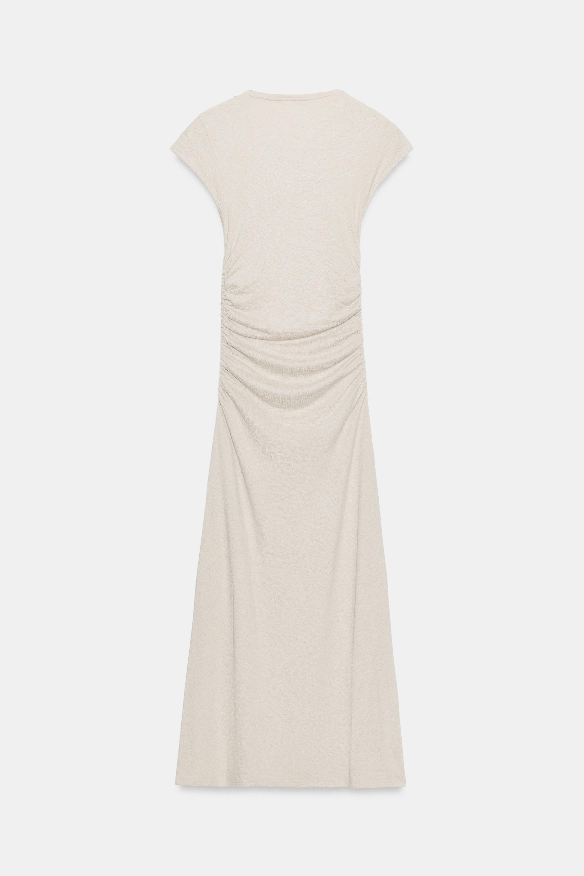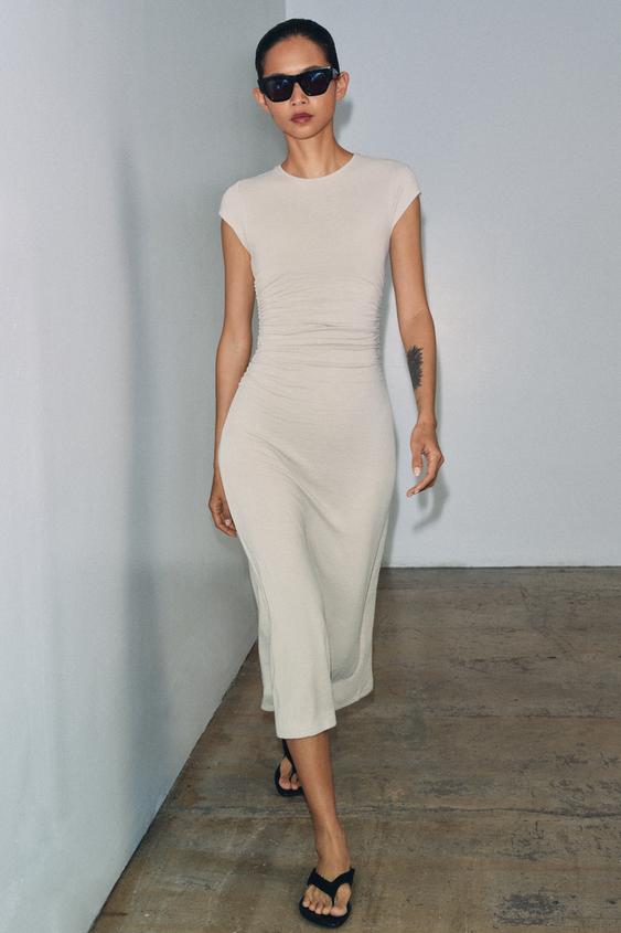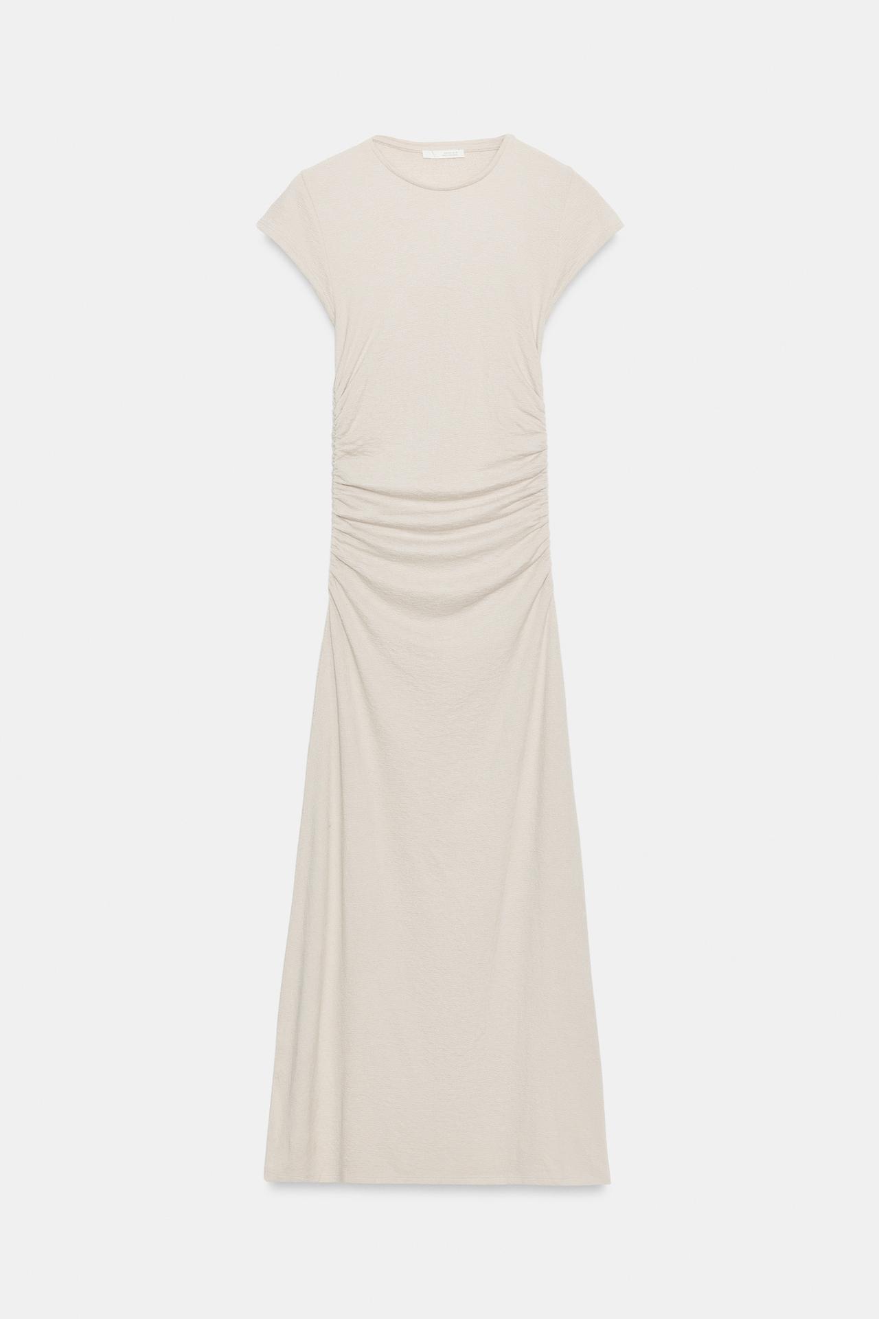 ZARA ПЛАТЬЕ МИДИ СО СБОРКАМИ, ПЕСОЧНЫЙ