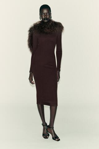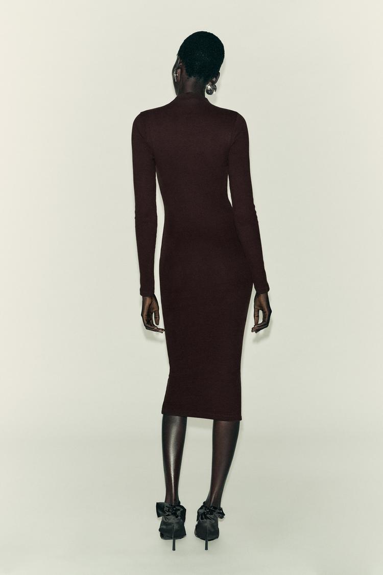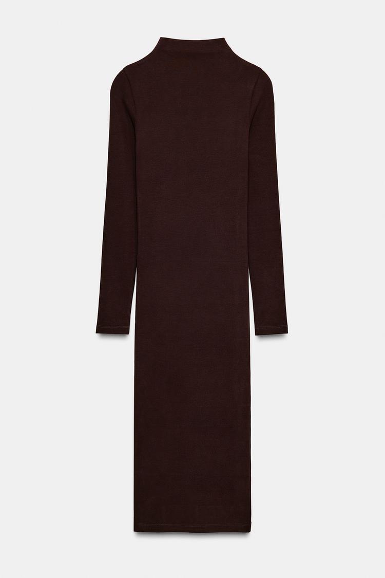 Платье миди из хлопковой пряжи. Воротник-стойка и длинные рукава. Мягкая ткань в рубчик. Прямой подол.