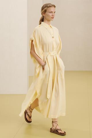 Миди-платье с основной тканью из лиоцелевой пряжи. С воротником и рукавами-накидками с лямками на плечах. Передние карманы. Регулируемая талия на пуговицах. Прямой подол с разрезом. Спереди застегнут на пуговицы.