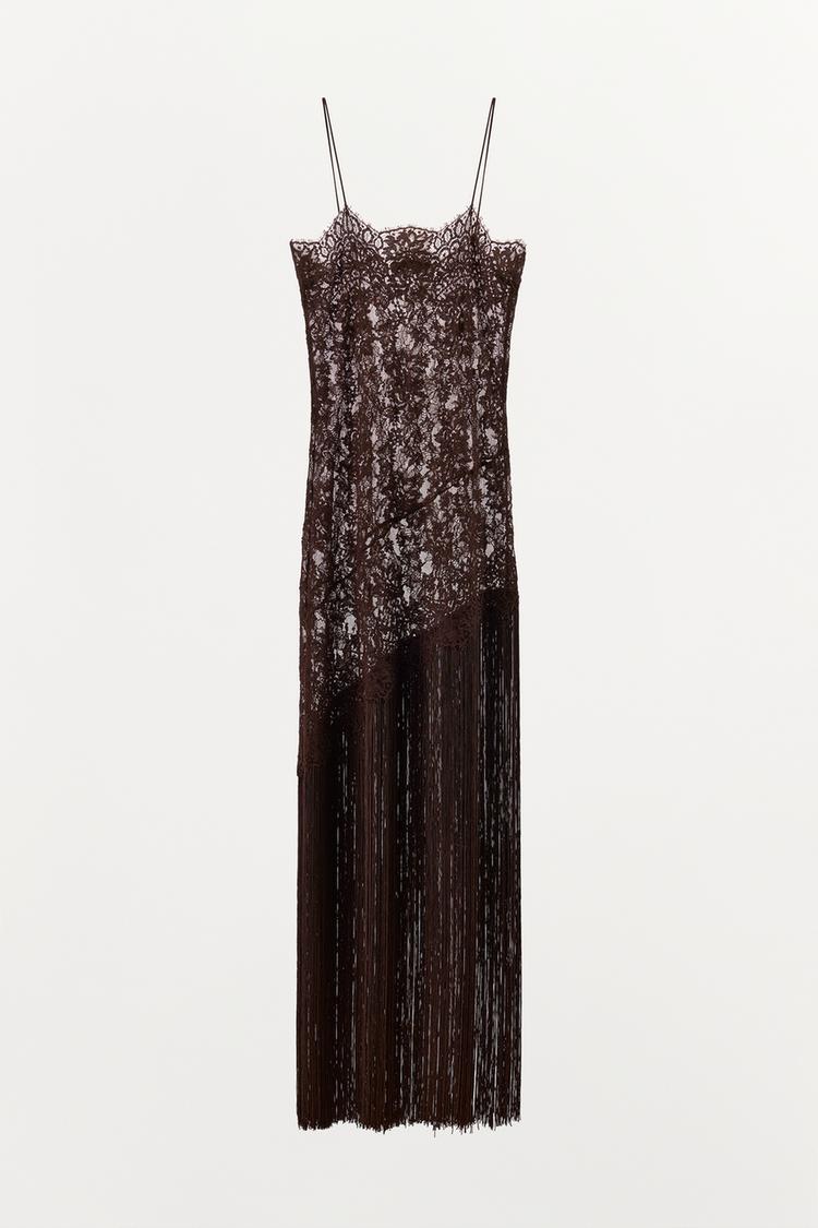 ZARA ПЛАТЬЕ НА БРЕТЕЛЯХ С КРУЖЕВОМ И БАХРОМОЙ, КОРИЧНЕВЫЙ