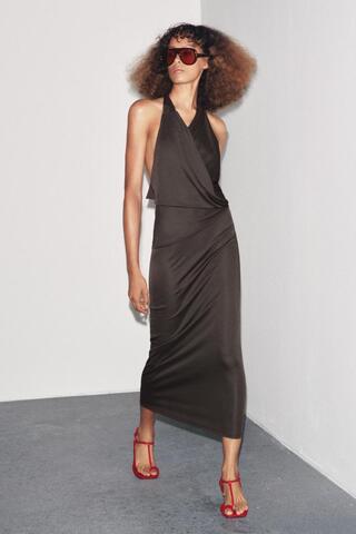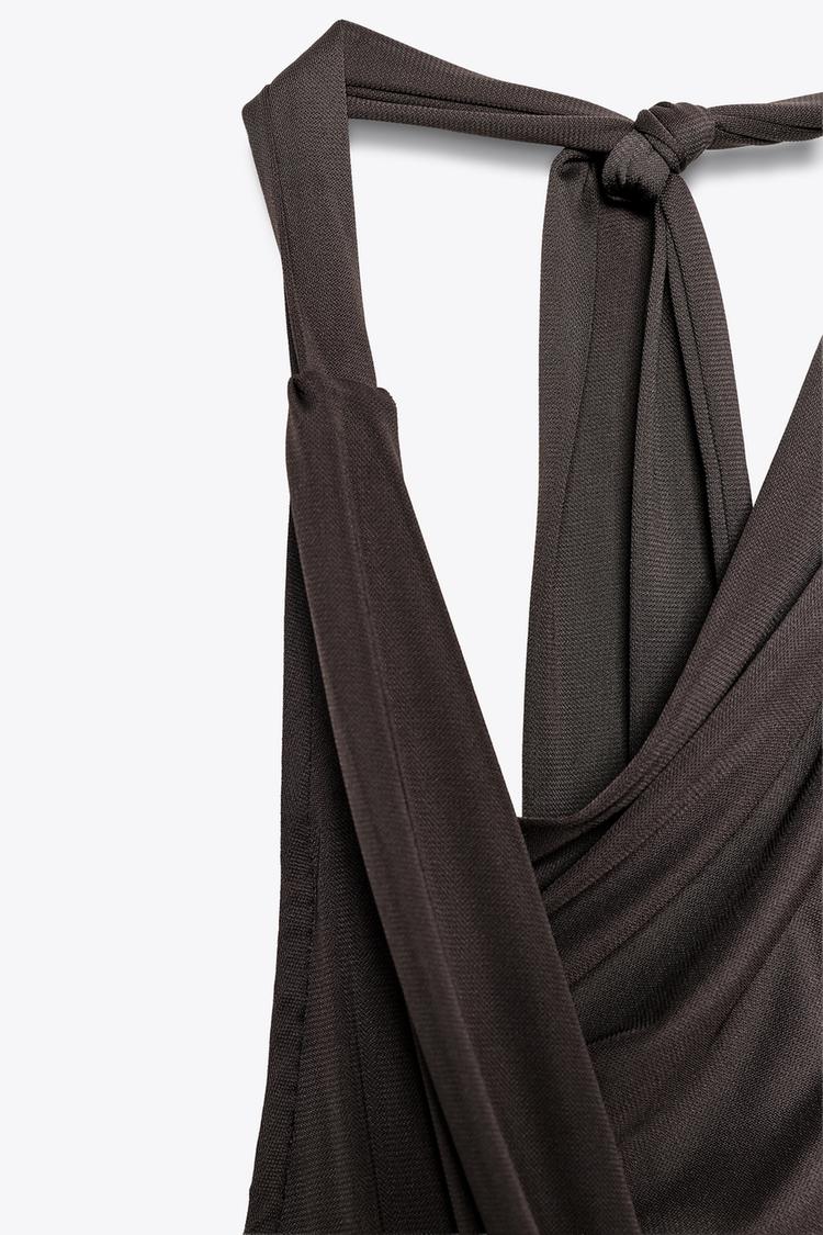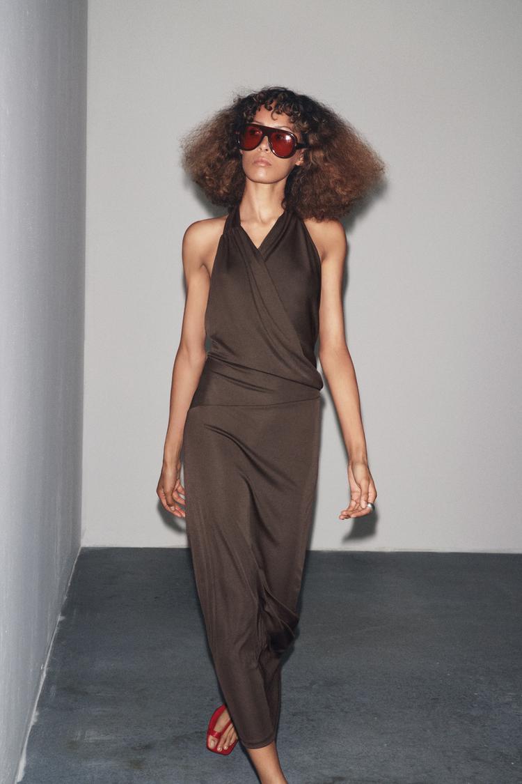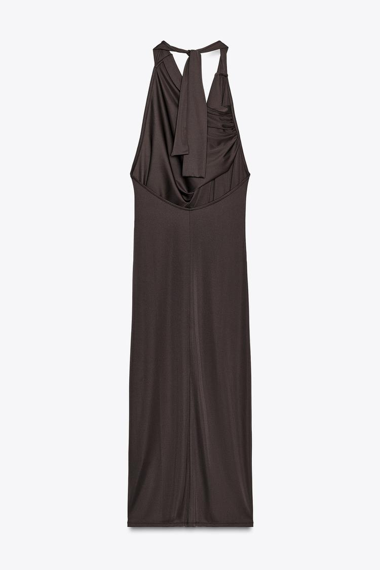 ZARA ПЛАТЬЕ С ДРАПИРОВАННЫМ ВЫРЕЗОМ И СКЛАДКАМИ, ТЕМНО-КОРИЧНЕВЫЙ