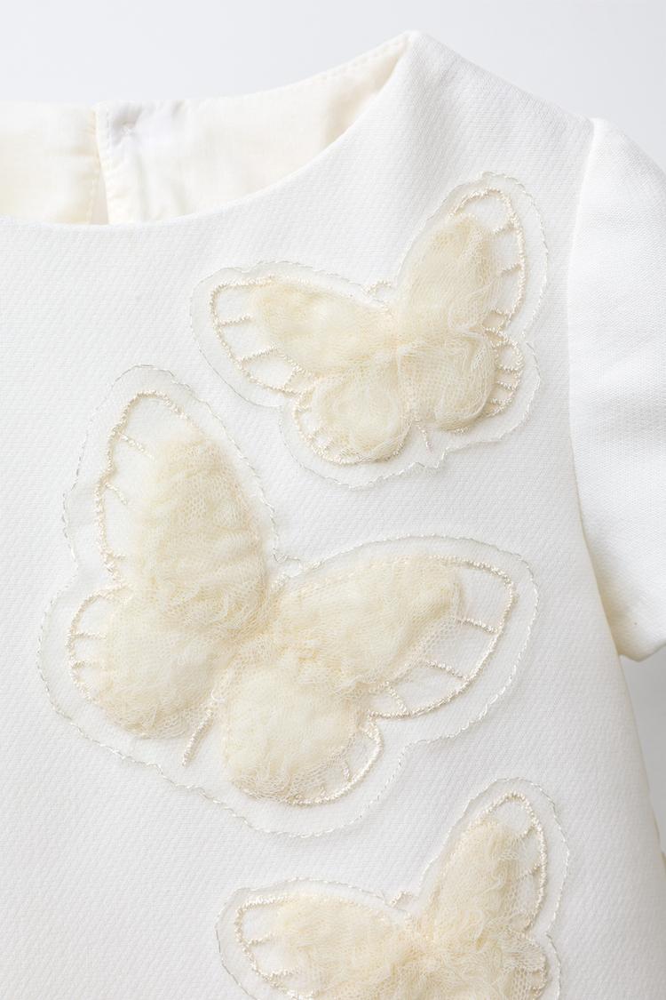 Платье с круглым вырезом горловины и короткими рукавами. Сзади с пуговицами в виде капли. Спереди с аппликацией в виде бабочки и тюля.