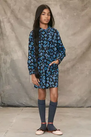 Платье с длинным рукавом. Пуговица спереди в форме цветка. С накладными карманами спереди. Принт.