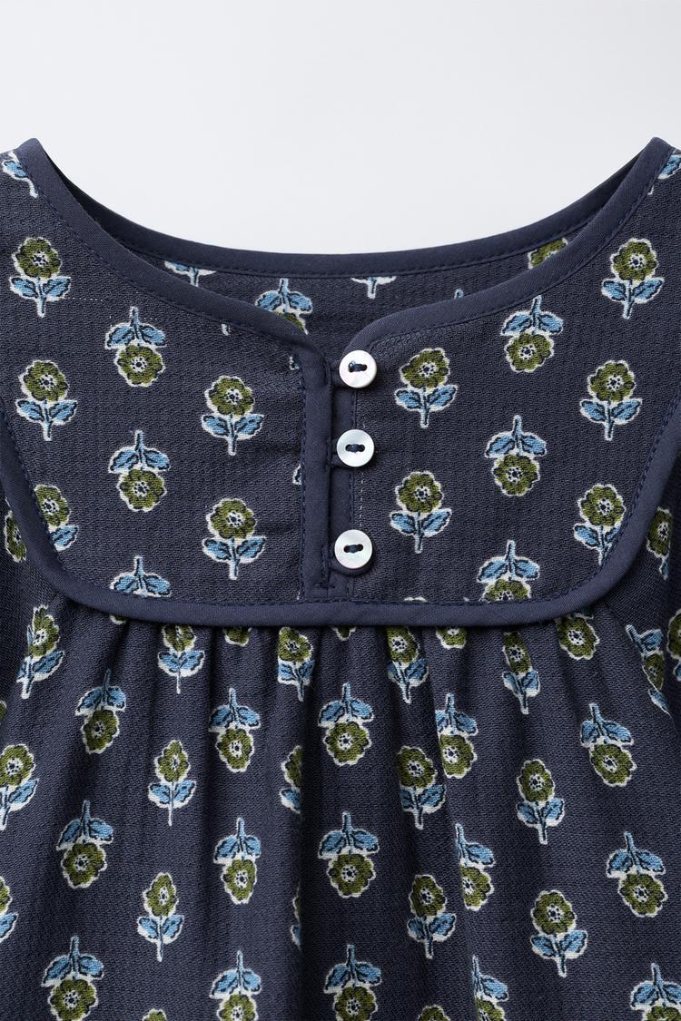 Платье с круглым вырезом и длинными рукавами на резинке. Застежка на пуговицы на кокетке. Цветочный принт.