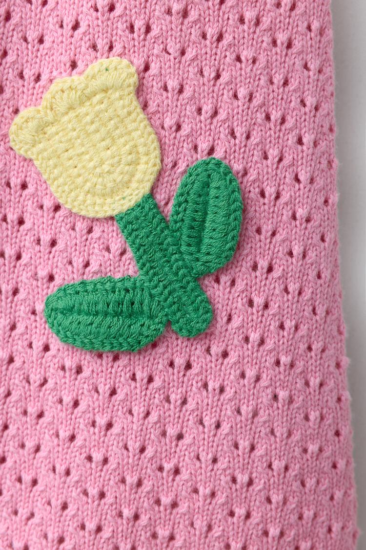 Платье с круглым вырезом и бретельками. Аппликация в виде тюльпанов кроше спереди.