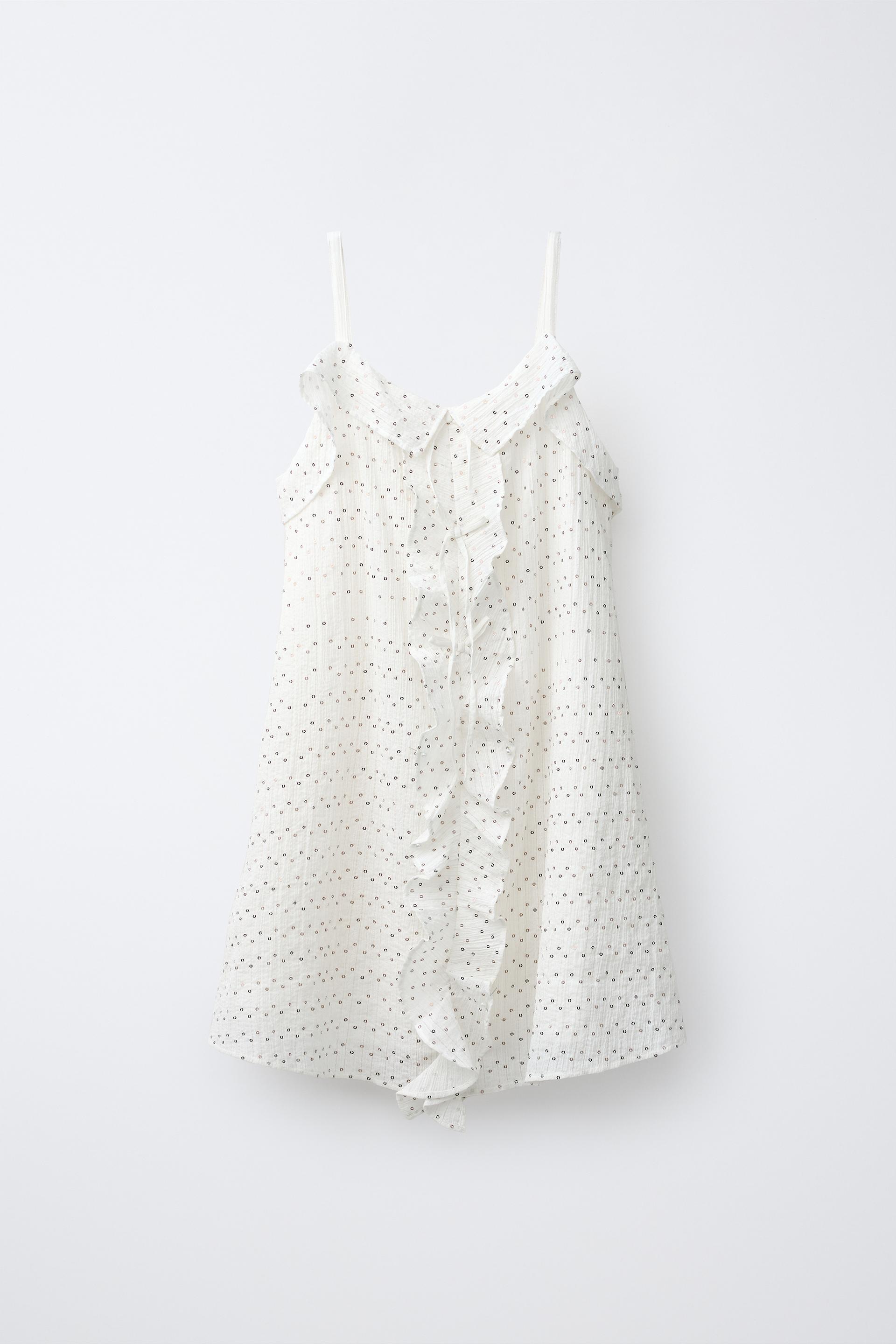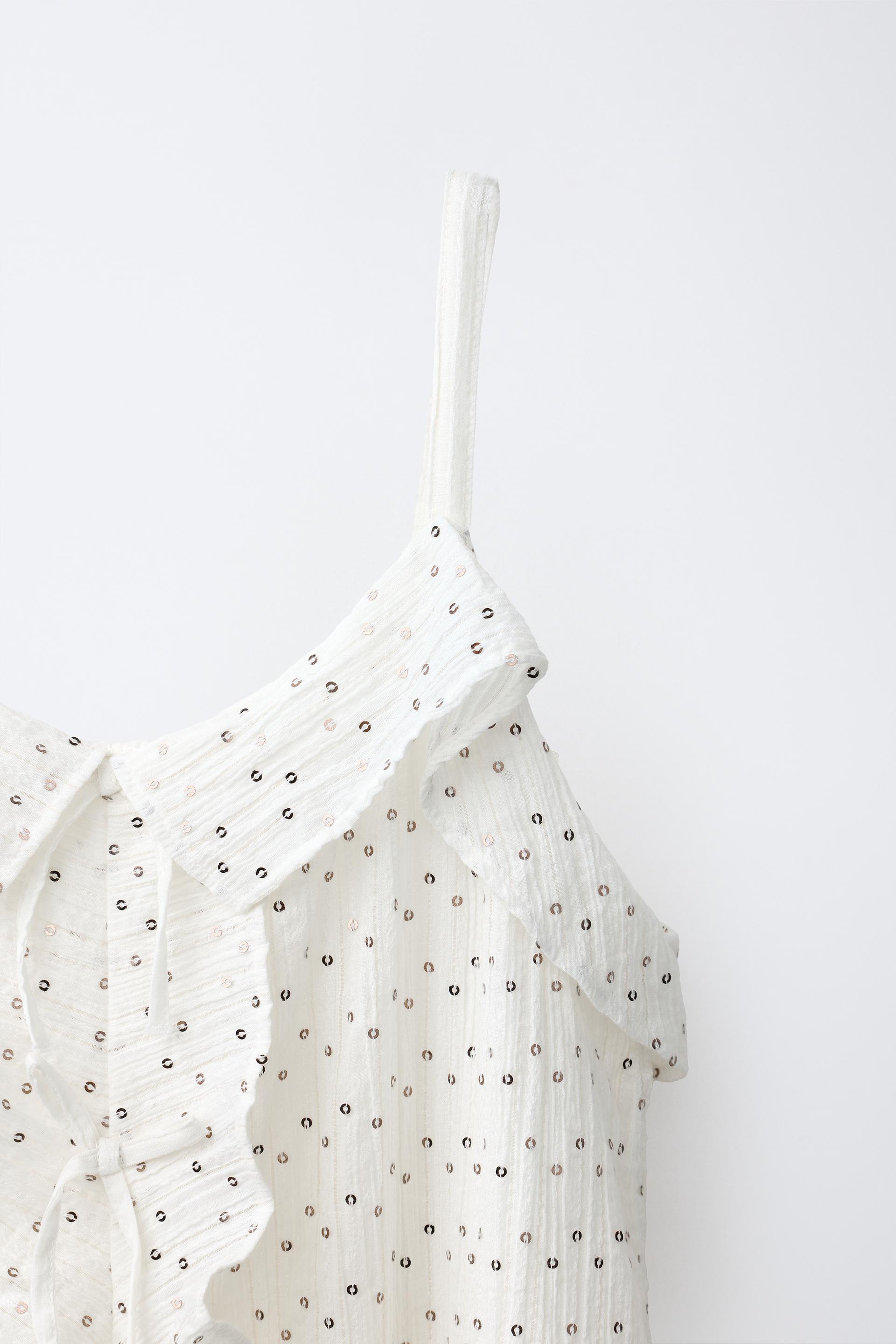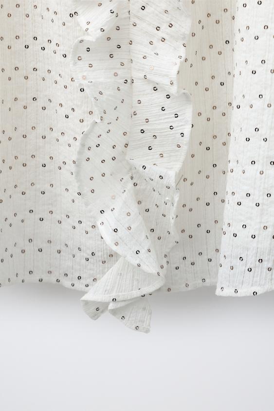 ZARA ПЛАТЬЕ С ВОЛАНАМИ И ПАЙЕТКАМИ, ЖЕЛТОВАТО-БЕЛЫЙ