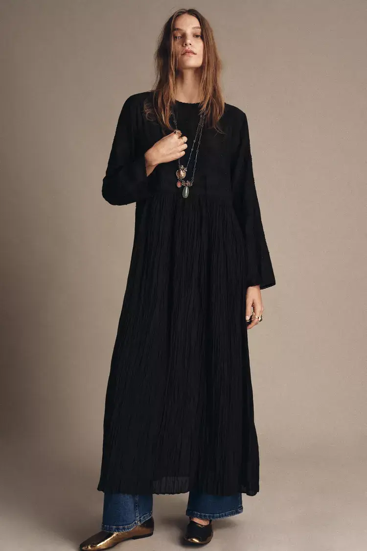 Платье из вискозы и хлопка. Круглый вырез горловины, длинные рукава. Вышивка с бусинами. Жатая ткань. Застежка на пуговицу сзади.