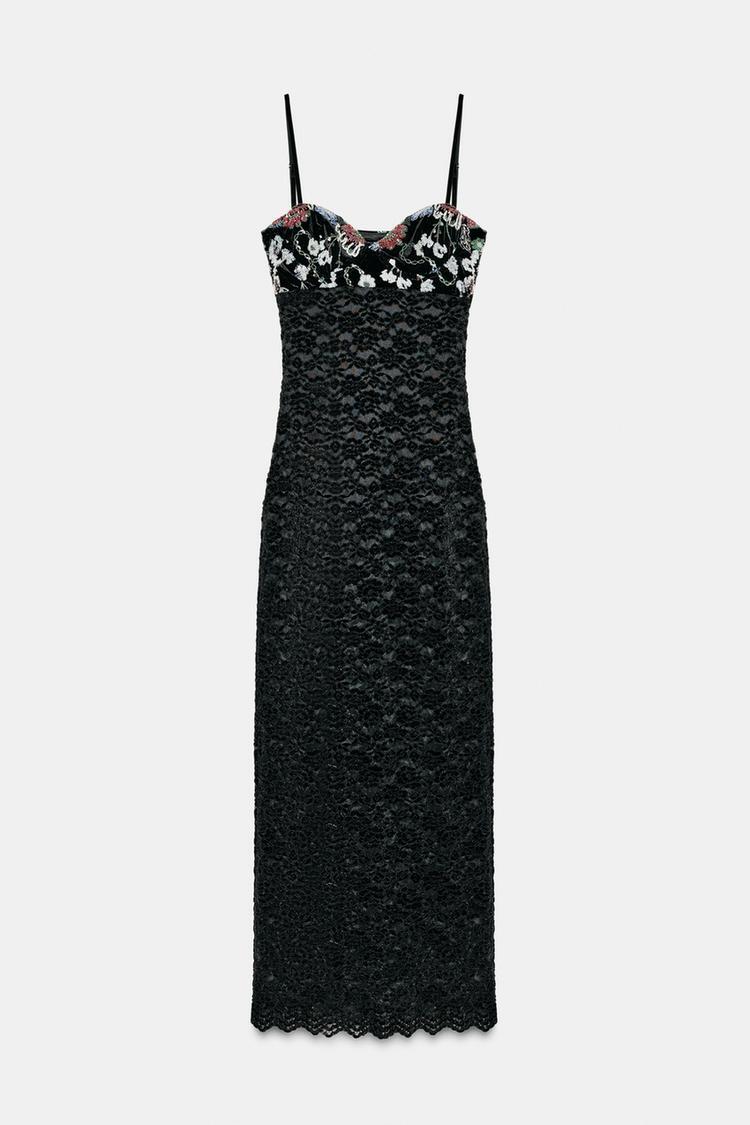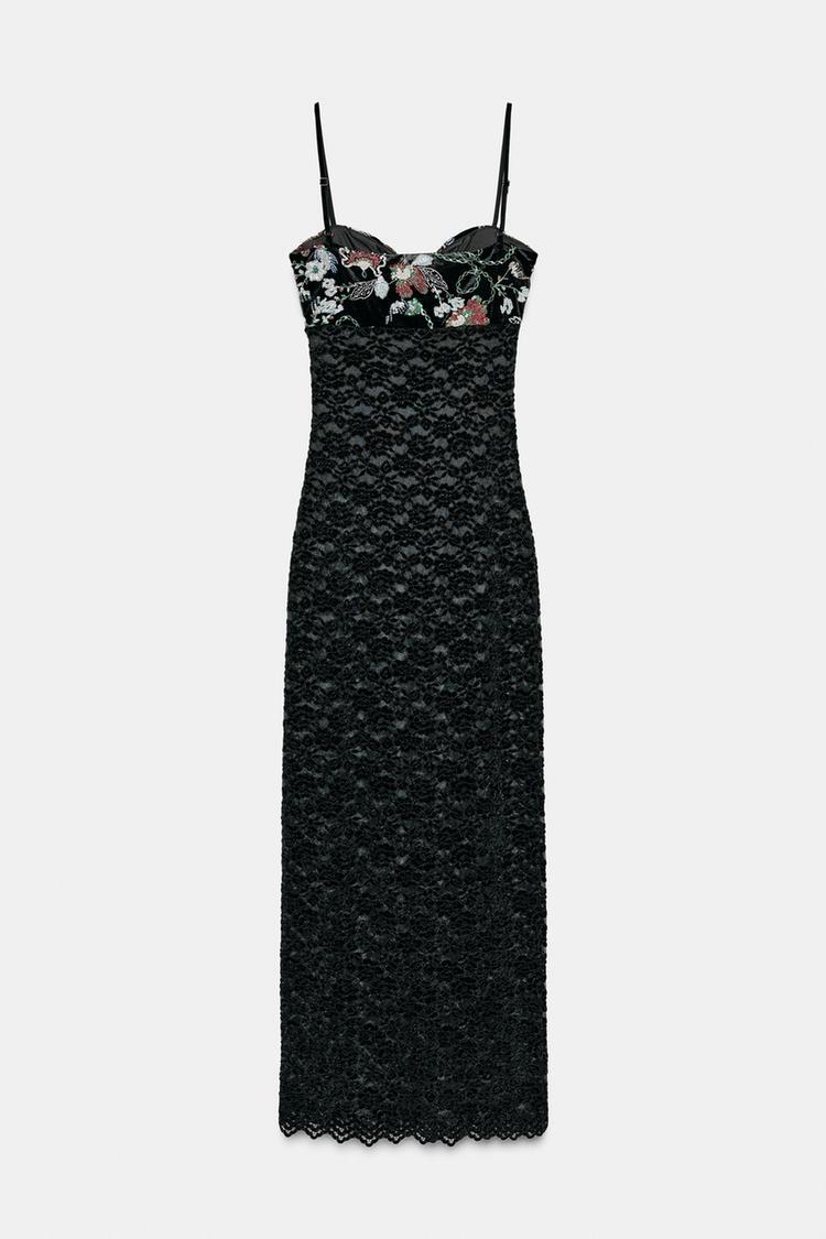ZARA ПЛАТЬЕ С ВЫШИВКОЙ И КРУЖЕВОМ, ЧЕРНЫЙ