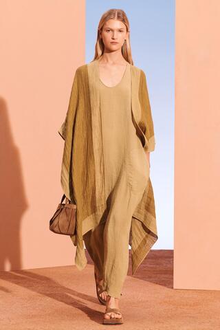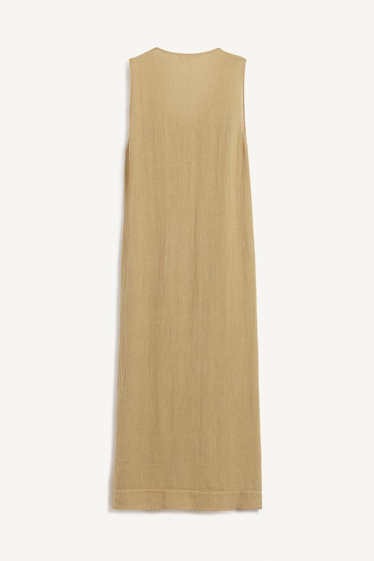 Туника-платье из смеси льна. С круглым вырезом и без рукавов. Карманы спрятаны в боковые швы. Юбка прямого кроя с разрезом на подоле.