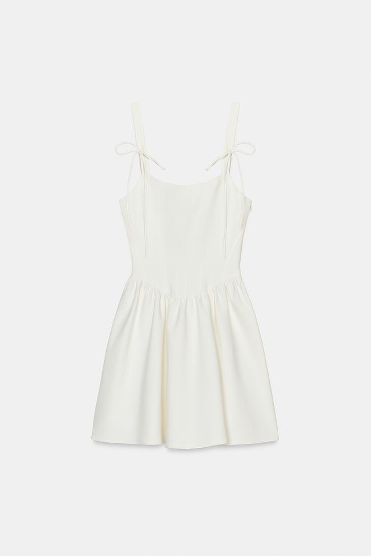 Короткое платье с круглым вырезом и регулируемыми бретелями с завязками. Подкладка в тон. Потайная застежка-молния сбоку.