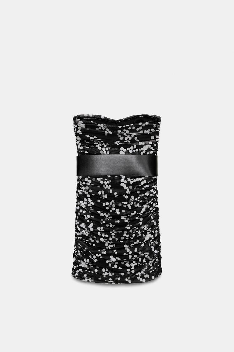 ZARA ПЛАТЬЕ В ГОРОШЕК С ПОЯСОМ, ЧЕРНЫЙ/БЕЛЫЙ