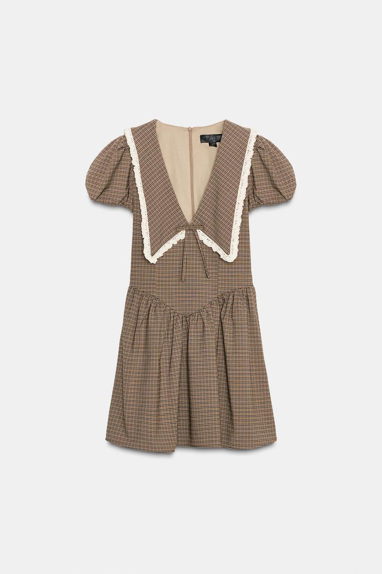 ZARA ПЛАТЬЕ В КЛЕТКУ С КРУГЛЫМ ВОРОТНИКОМ, ОТТЕНКИ КОРИЧНЕВОГО