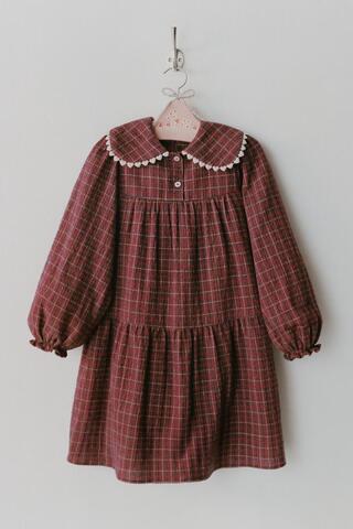 Платье с круглым воротником и длинными рукавами на резинке. Застежка на пуговицы на передней кокетке. Кружевная аппликация в виде сердца на воротнике.