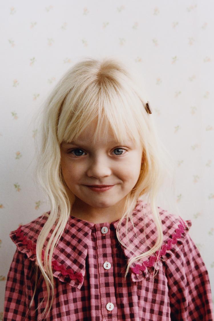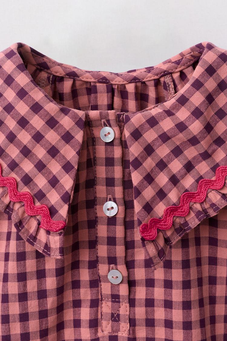 Платье с круглым воротником и длинными рукавами на резинке. Застежка на пуговицы спереди. Волнистый край на подоле и воротнике. Принт в клетку виши.