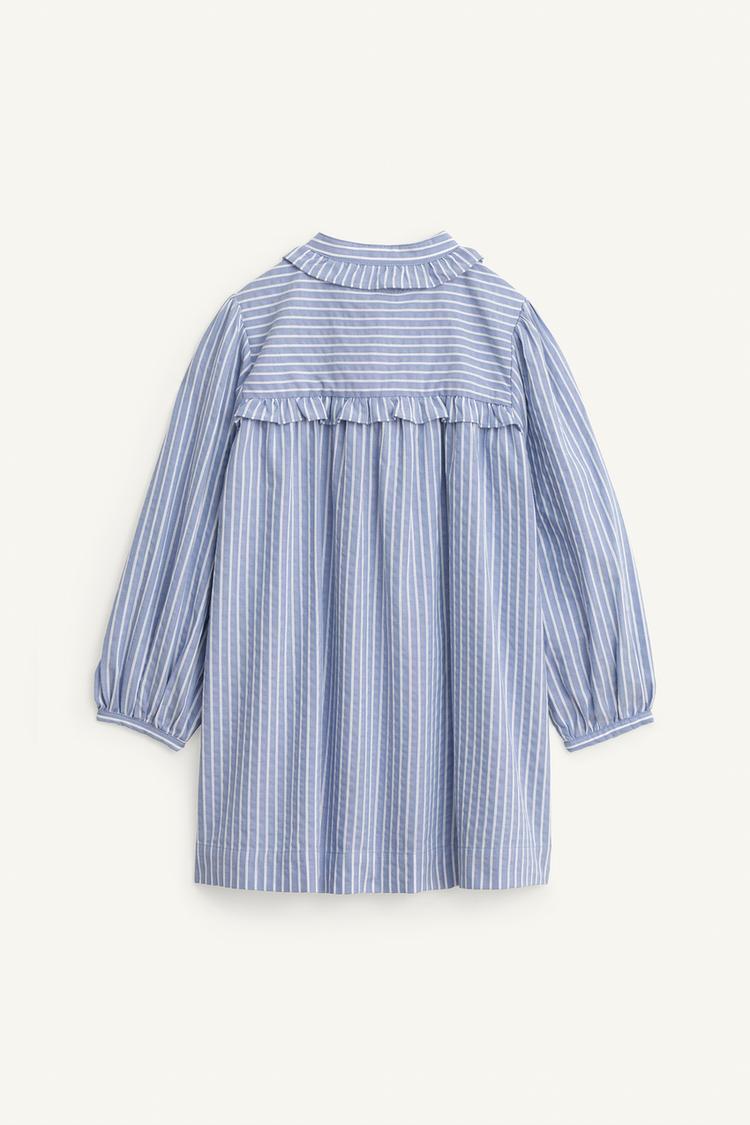 Платье с круглым вырезом, длинными рукавами и эластичными манжетами. Застежка на пуговицы спереди, на кокетке. Аппликация из рюш на воротнике и груди. Полосатый узор.
