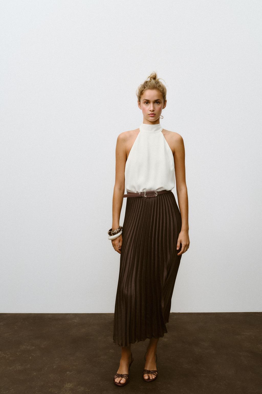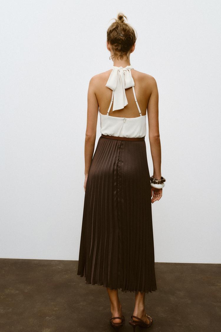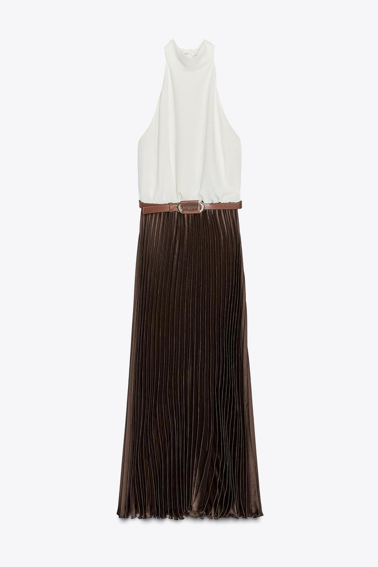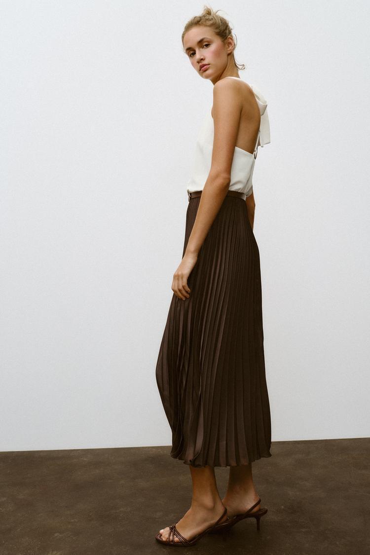 ZARA ПЛИССИРОВАННОЕ ПЛАТЬЕ МИДИ, КОРИЧНЕВЫЙ