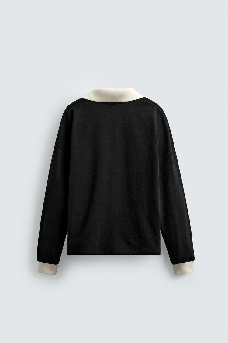 Толстовка-поло свободного кроя из ткани с хлопком и коноплей. Воротник с лацканами контрастной расцветки спереди и длинные рукава с отделкой в рубчик.