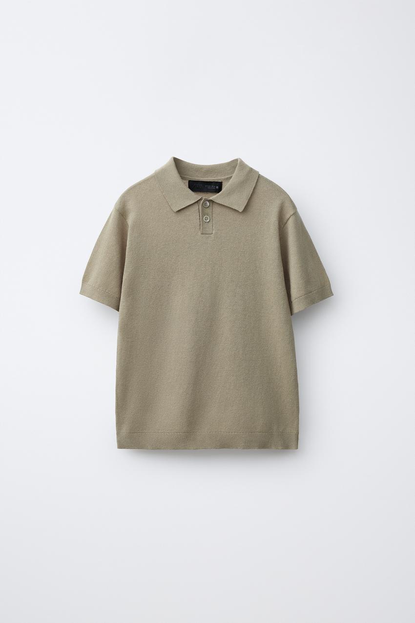 ZARA ПОЛО ИЗ ХЛОПКА И ЛЬНА В ПОЛОСКУ, СВЕТЛЫЙ ХАКИ