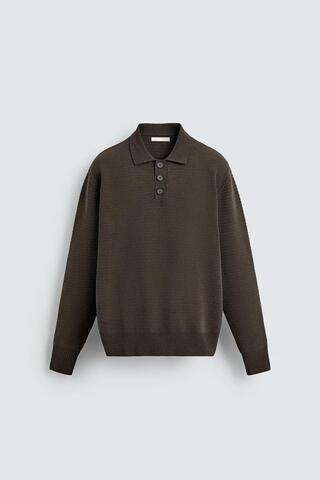 Поло классического кроя из текстурированной синели. Отложной воротник с застежкой на пуговицы спереди. Длинные рукава. Детали в рубчик.