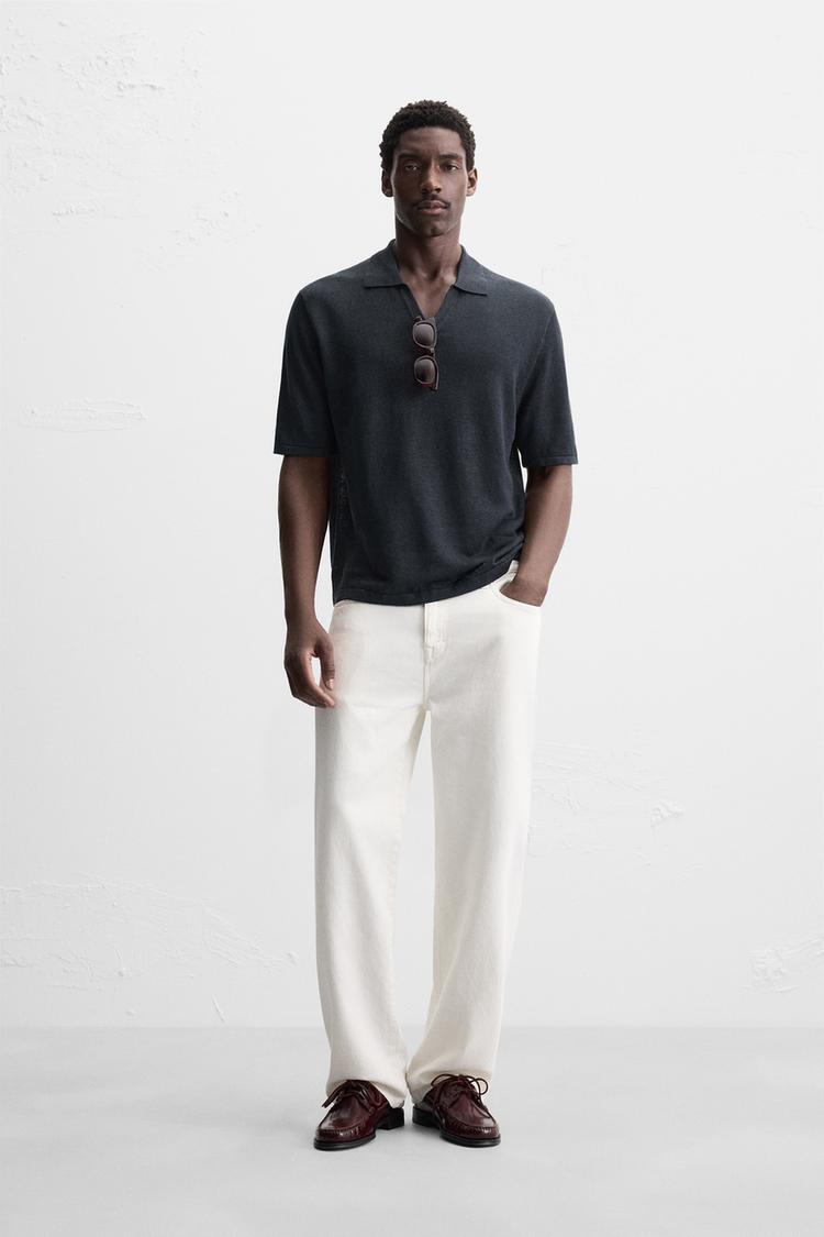 Поло классического кроя из конопли. Воротник с разрезом спереди. Короткие рукава, детали в рубчик.