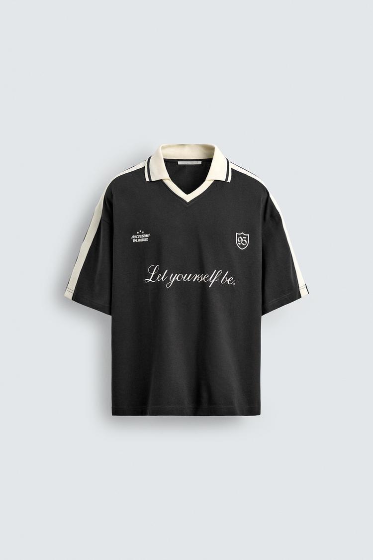 ZARA ПОЛО С РЕТРО-ФУТБОЛЬНЫМ ПРИНТОМ, ЧЕРНЫЙ