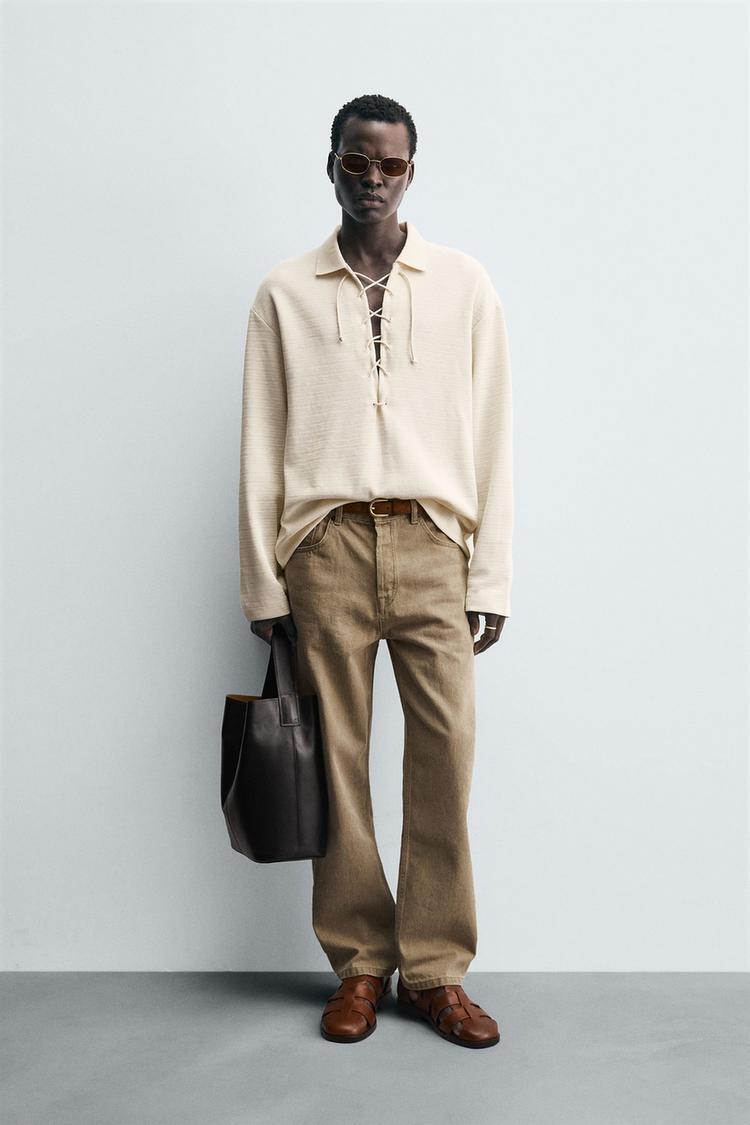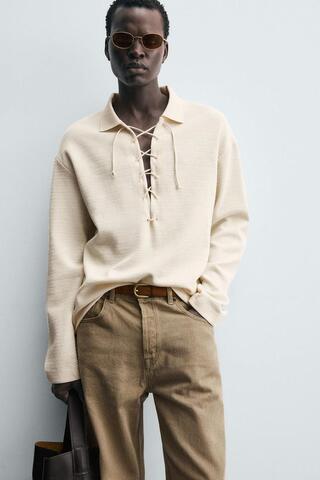 ZARA ПОЛО С ТЕКСТУРОЙ И ШНУРКОМ, ЖЕЛТОВАТО-БЕЛЫЙ