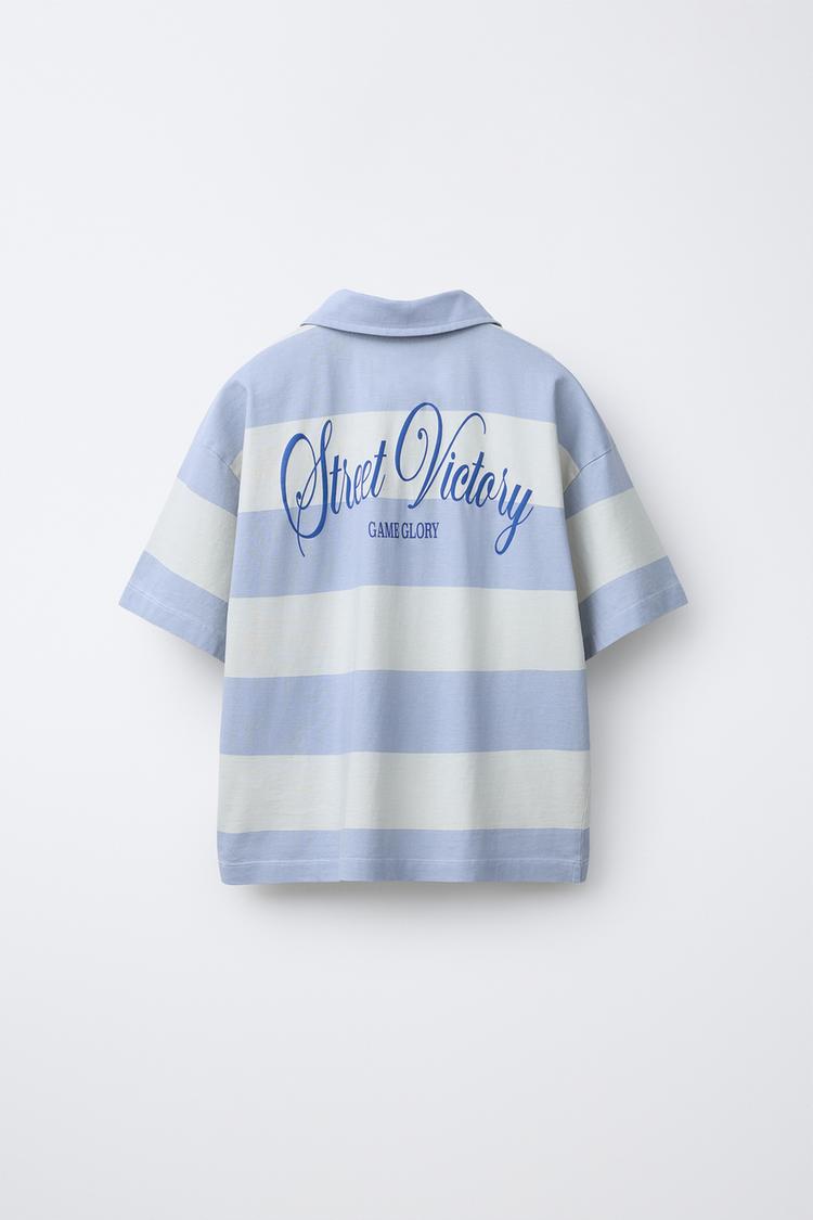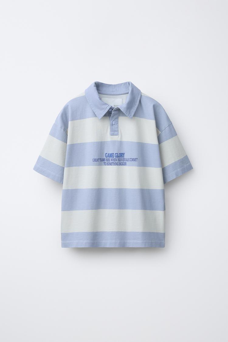 Поло с воротником поло и короткими рукавами. Принт в полоску и текст спереди и сзади.