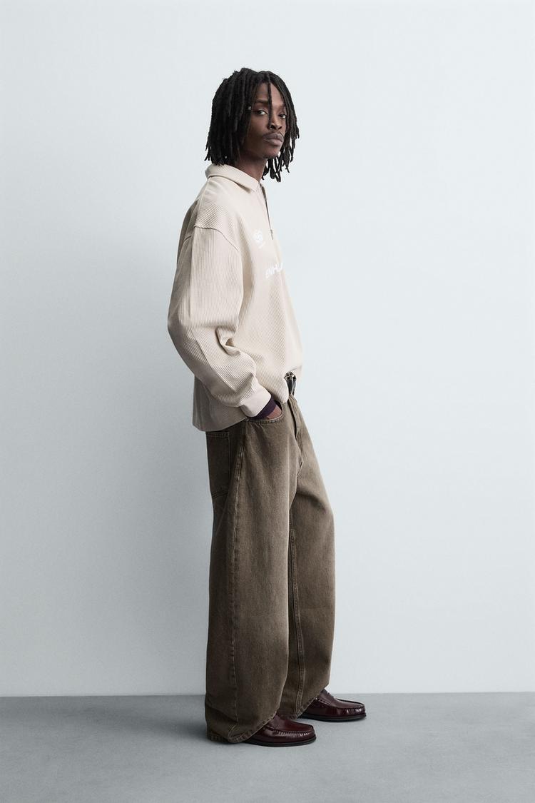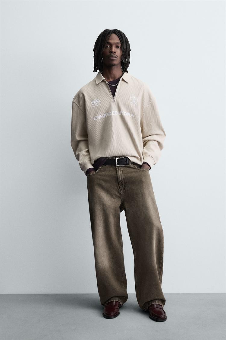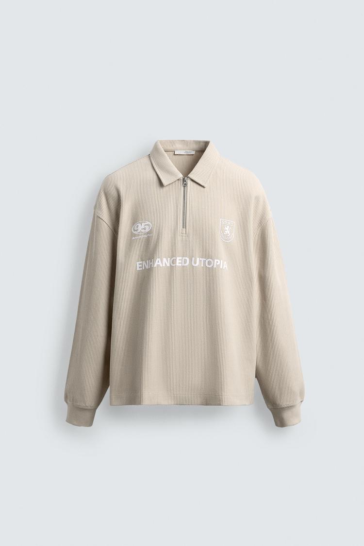 Поло свободного кроя. Воротник с лацканами и застежкой-молнией спереди. Длинные рукава с манжетами в рубчик. Комбинированные контрастные принты спереди.