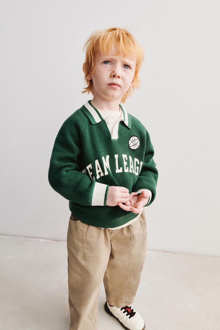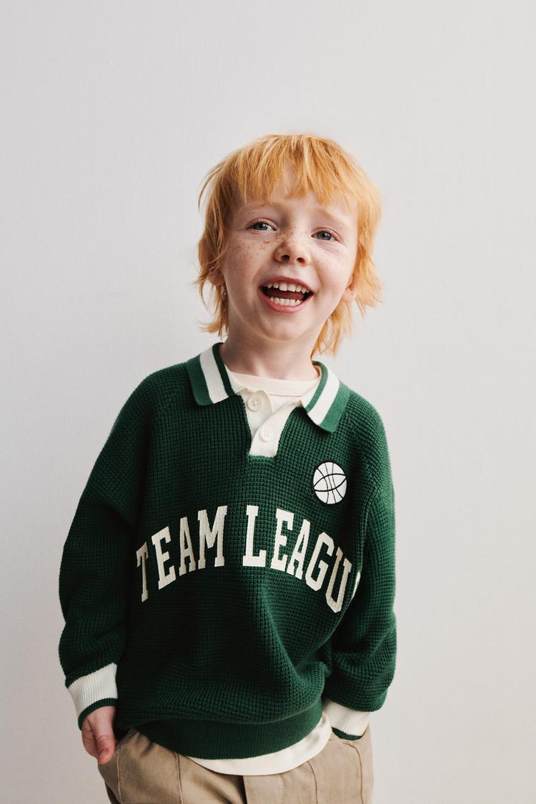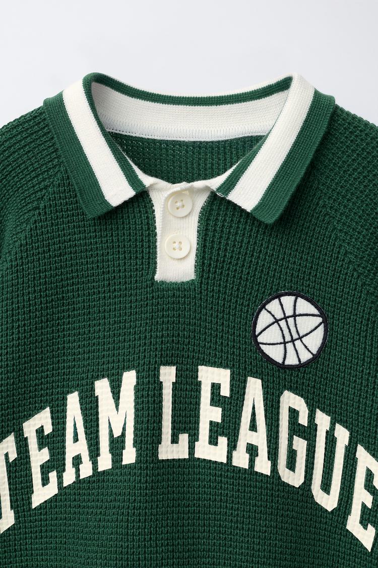 Трикотажное поло с воротником-поло и длинными рукавами с манжетами. Застежка на пуговицы на кокетке. Текстовый принт и нашивка с мячом спереди.