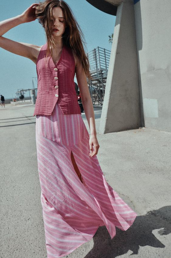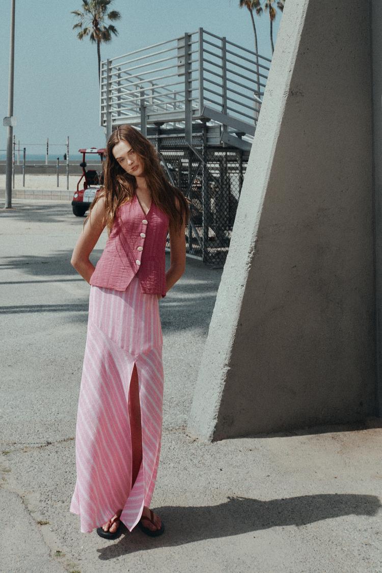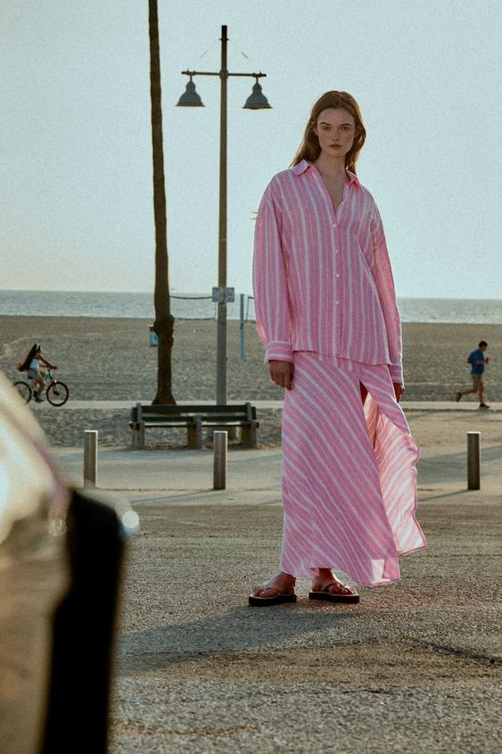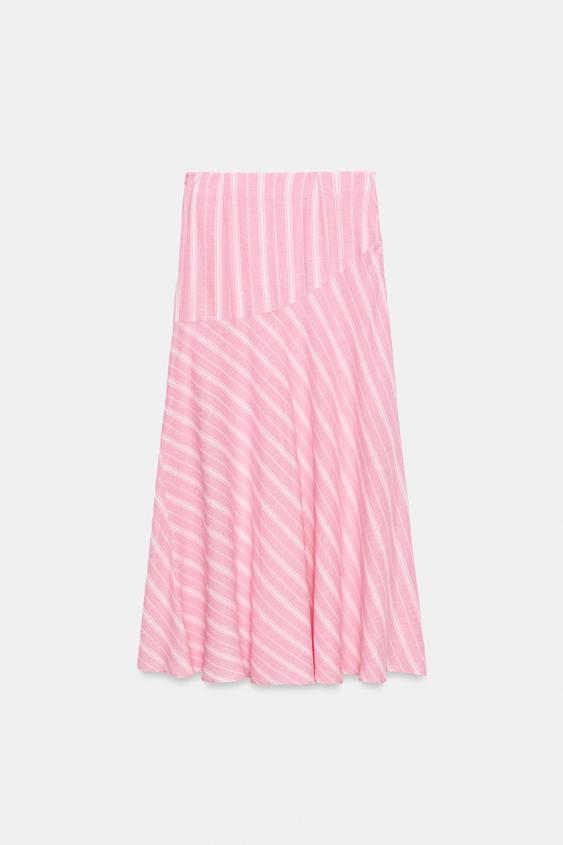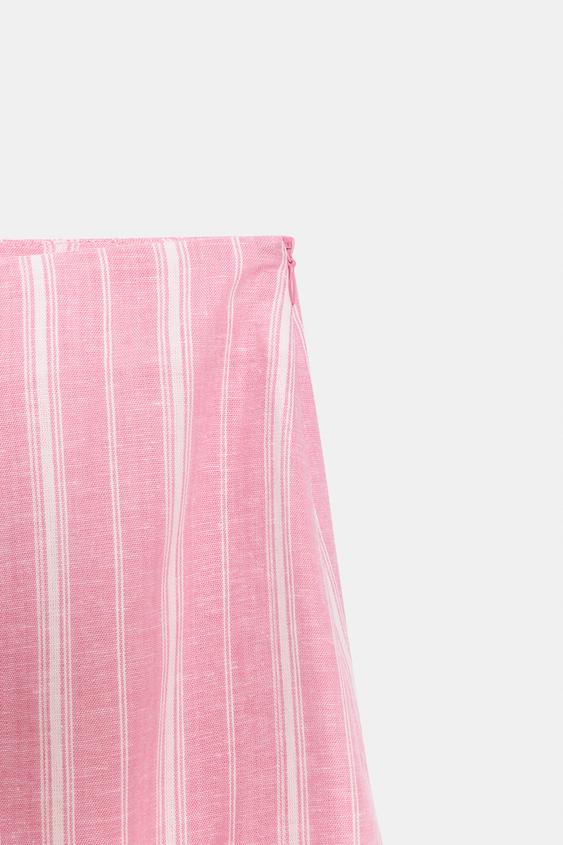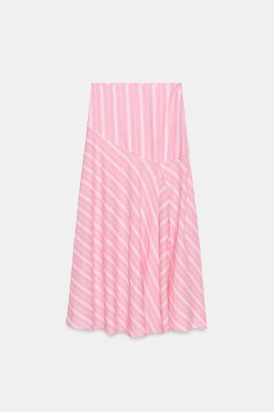 ZARA ПОЛОСАТАЯ ЮБКА МИДИ ИЗ ЛЬНА, РОЗОВЫЙ/БЕЛЫЙ