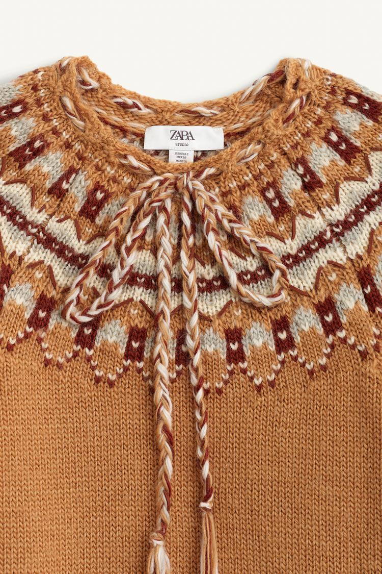 Пончо из 100% шерстяной пряжи. Регулируемый воротник-циклетка, длинные рукава с завязками на резинке. Детали с кисточками.