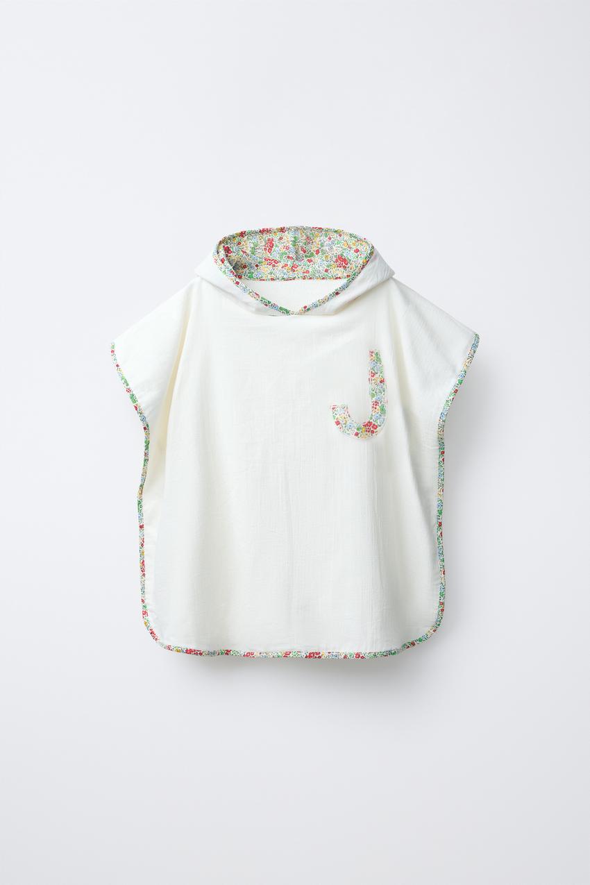 ZARA ПОНЧО-ПОЛОТЕНЦЕ С ЦВЕТОЧНЫМ УЗОРОМ "J", БЕЛЫЙ