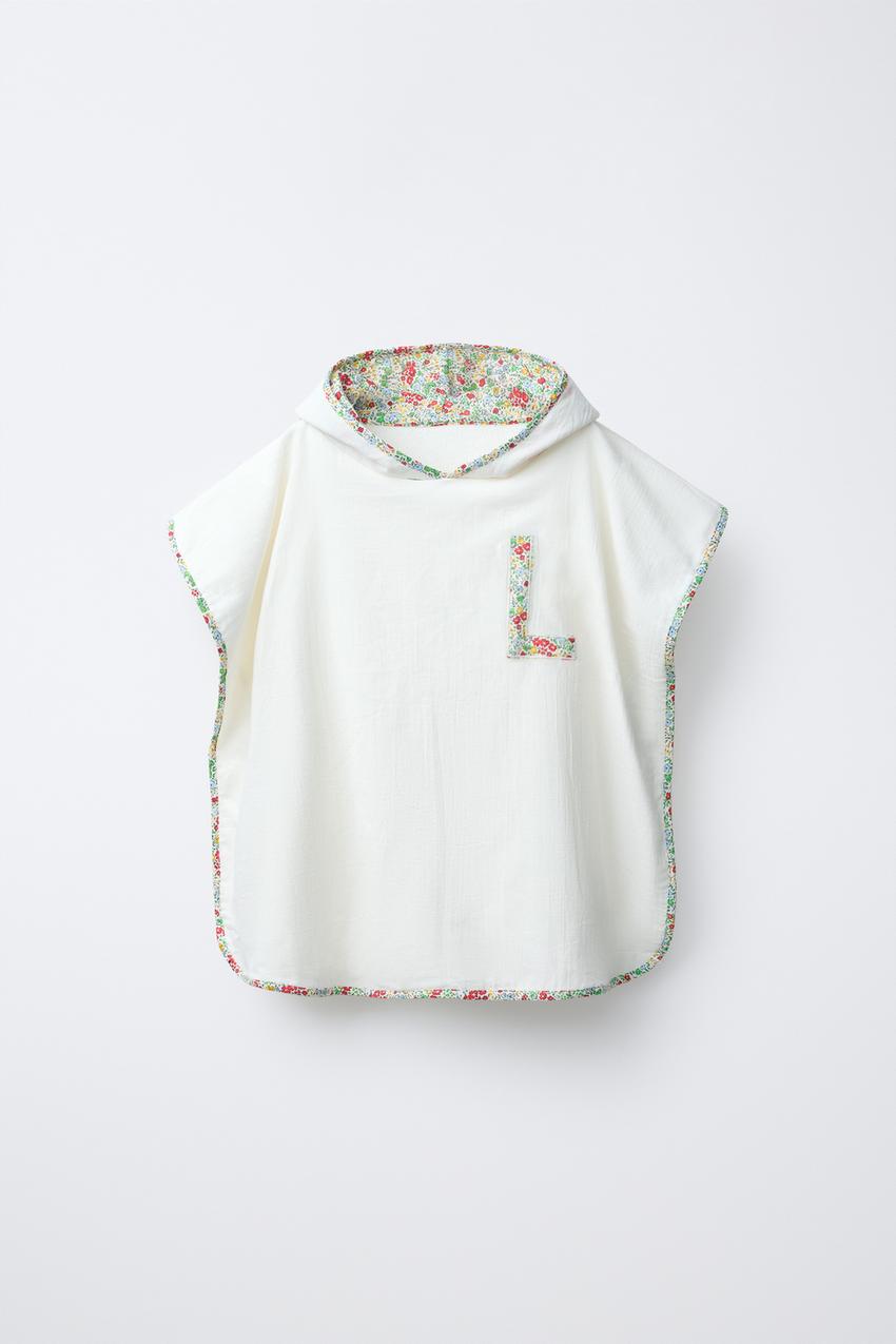 Пончо-полотенце с капюшоном. Вышитый инициал на груди и отделка с цветочным принтом.