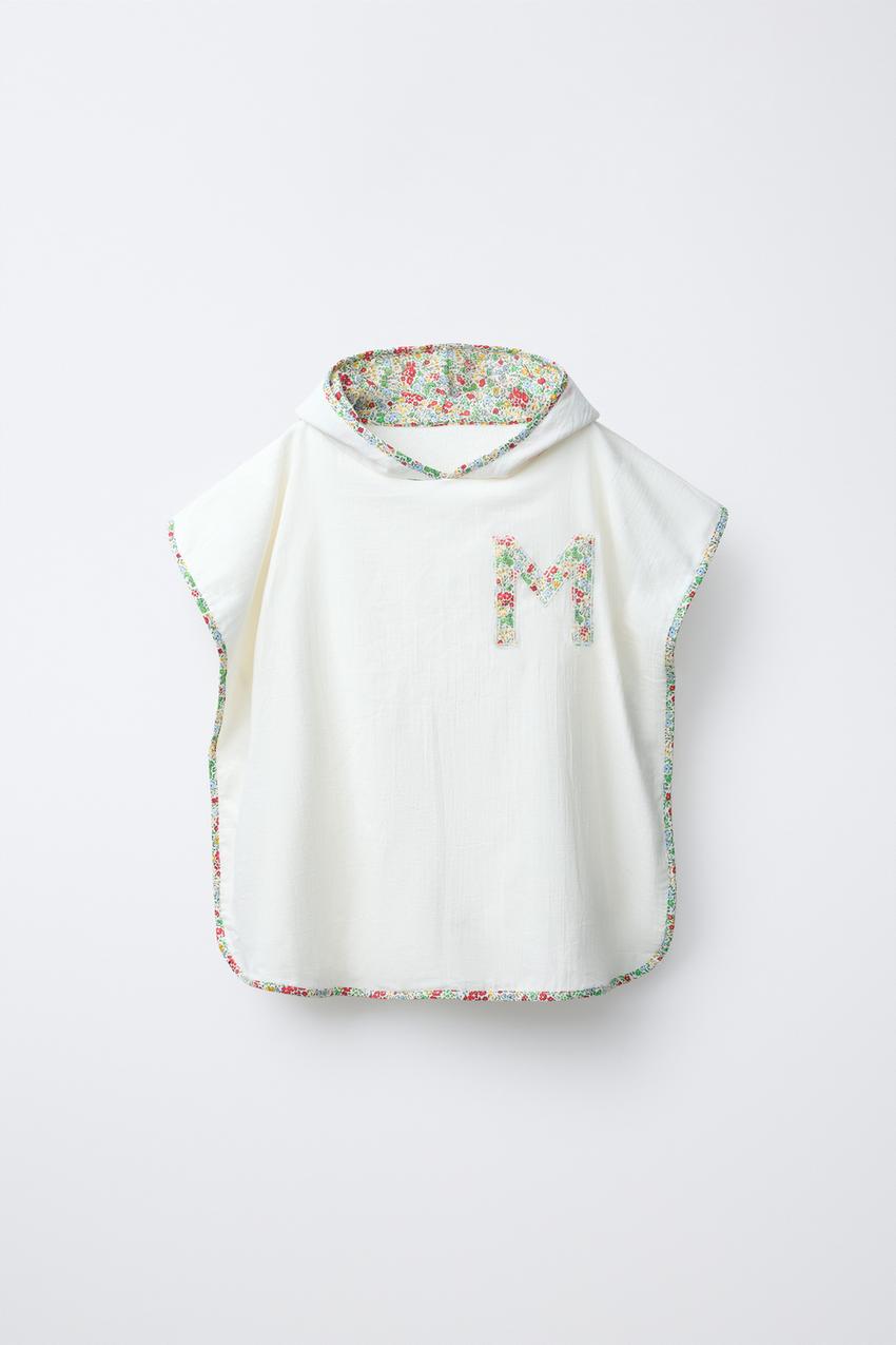 Пончо-полотенце с капюшоном. Вышитый инициал на груди и отделка с цветочным принтом.