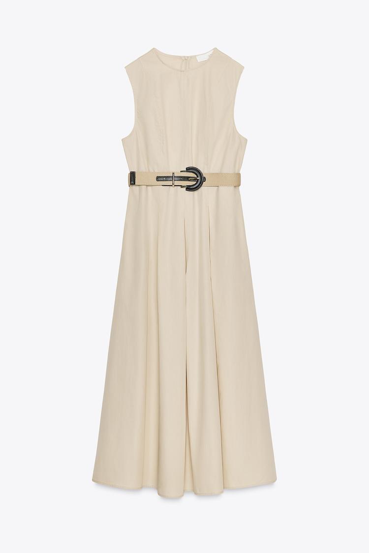 ZARA ПОПЛИНОВОЕ ПЛАТЬЕ-МИДИ С ПОЯСОМ, ПЕСОЧНЫЙ